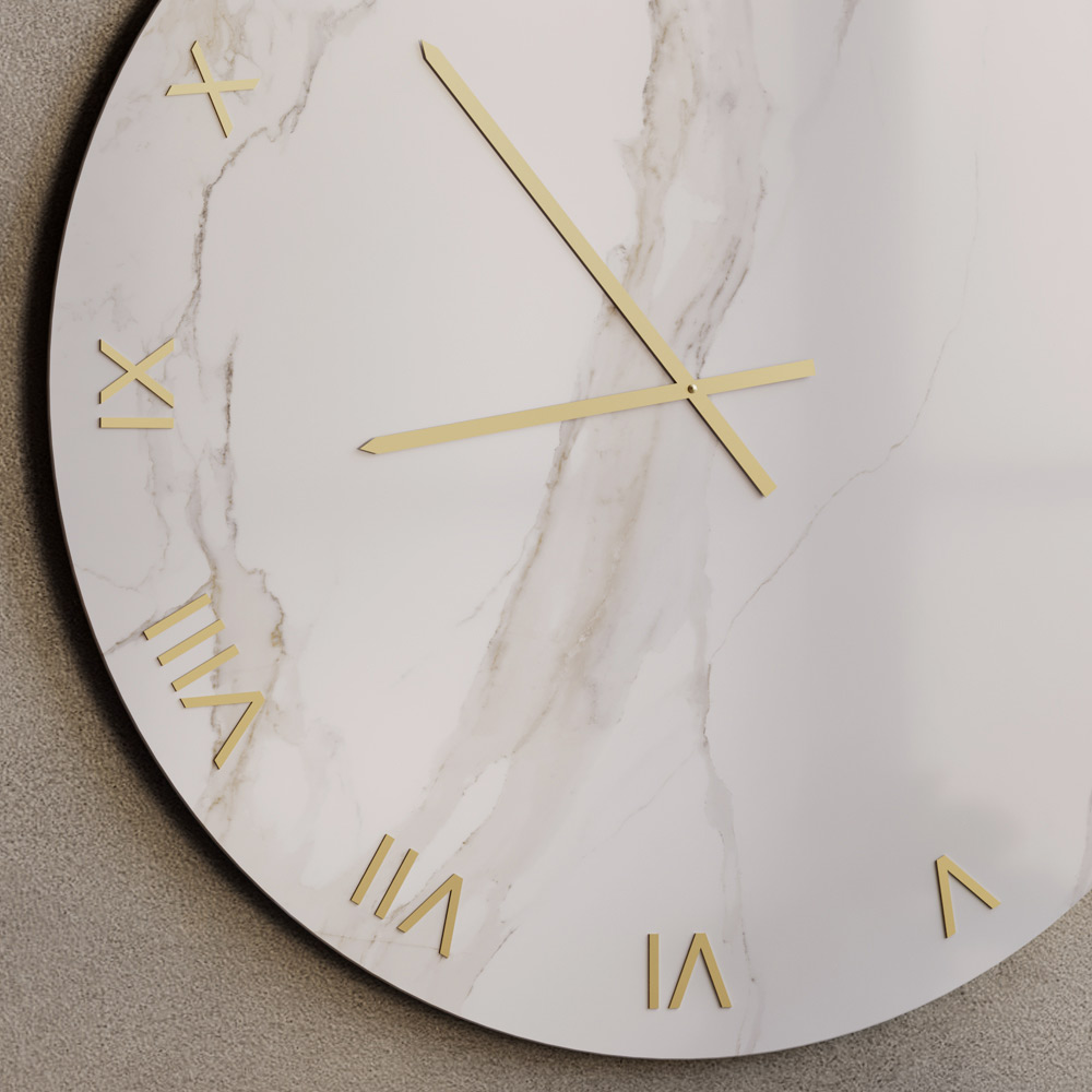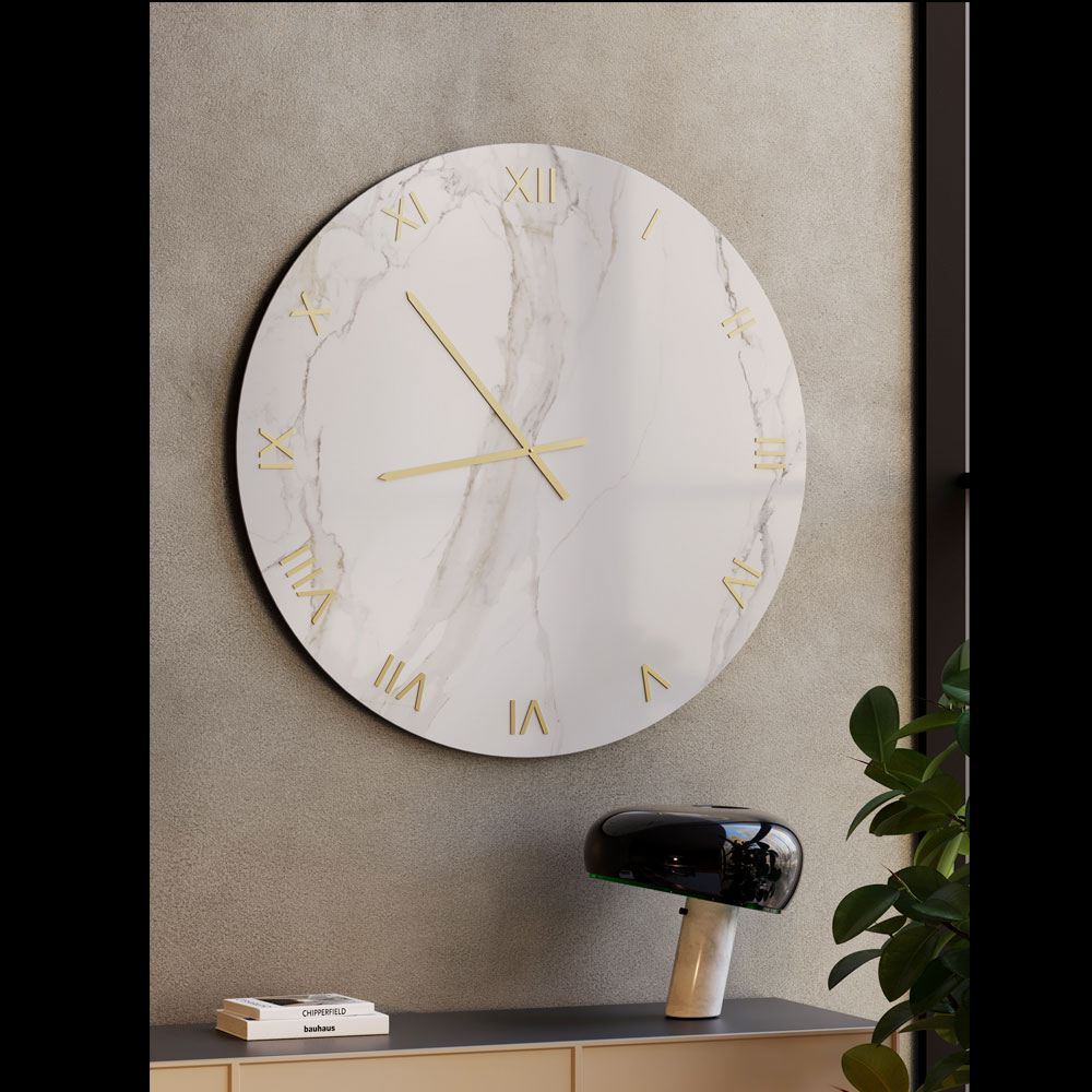 Glasvæguret med en silketrykt Calacatta-marmorfinish er et raffineret møbel, designet til at forbedre moderne og nutidige rum med et strejf af tidløs luksus. Glasoverfladen fremhæver de fine årer inspireret af naturlig marmor, hvilket skaber et elegant samspil mellem lys og dybde.