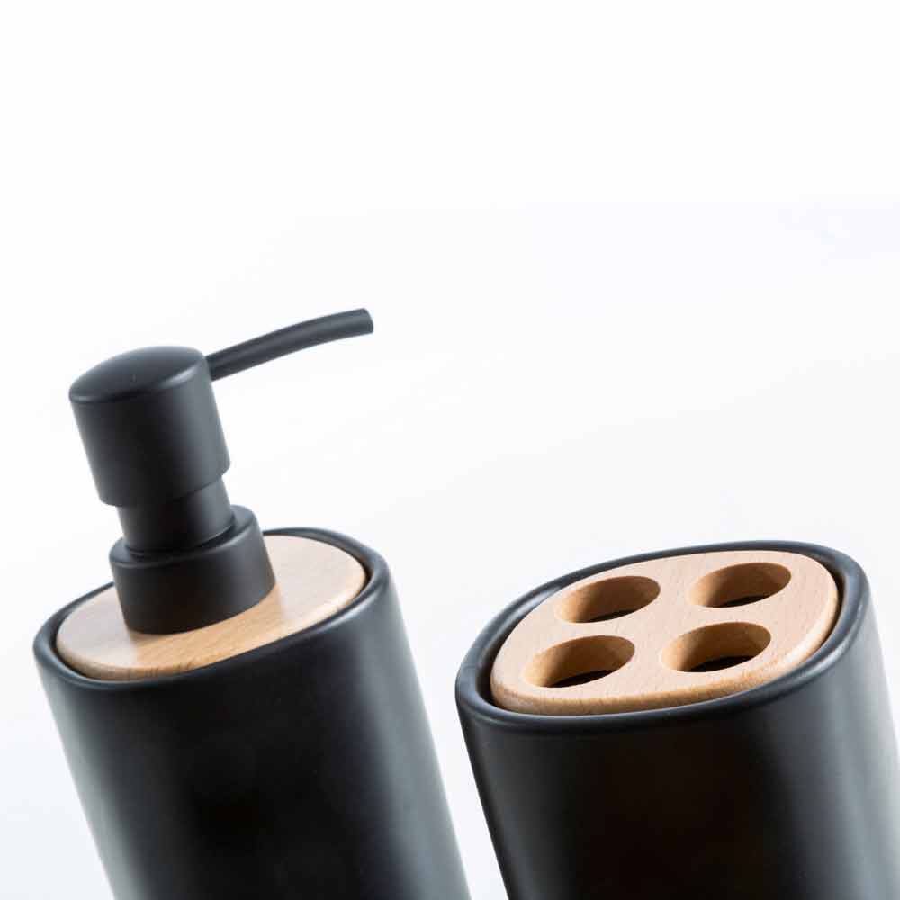Lavet af hvid eller sort keramik med naturlige trædetaljer, perfekt til at give dit badeværelse stil og elegance.