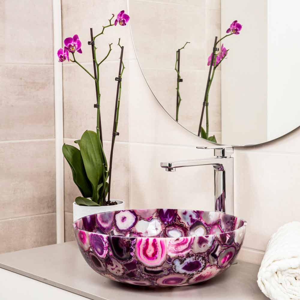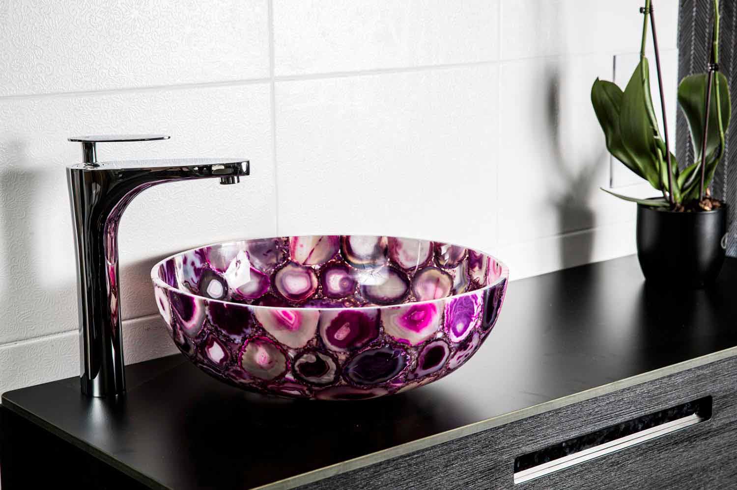 Buffalo er en farverig håndvask, der er lavet af halvædelst agatsten . Finishen er gennemsigtig.
