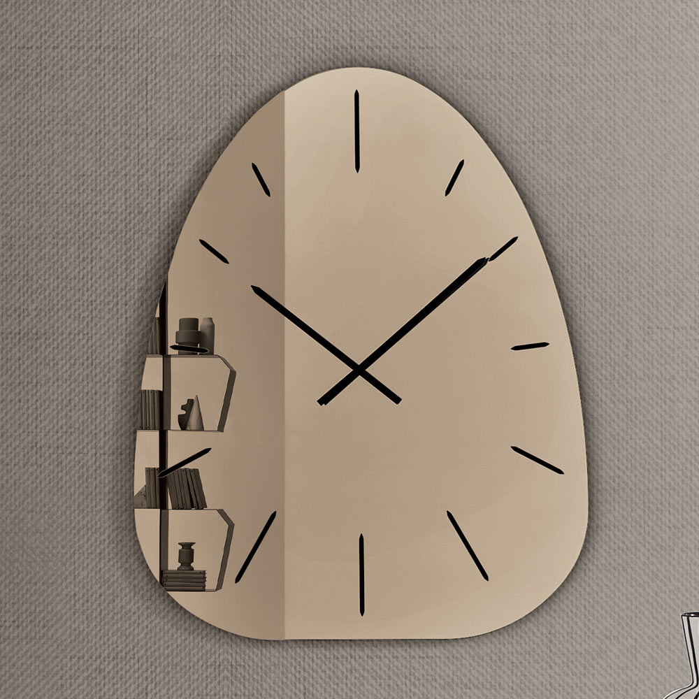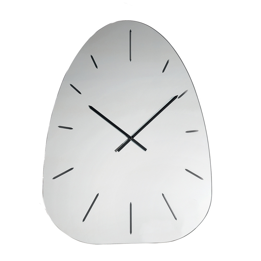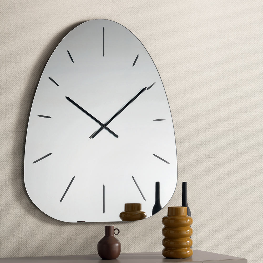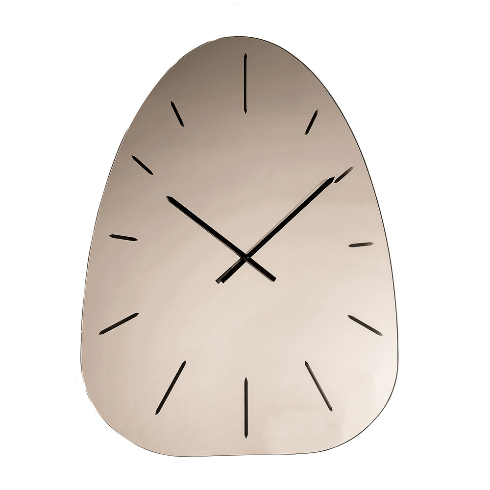 Uret er lavet af spejlglas og skiller sig ud med sine lasergraverede tal , der diskret træder frem fra den reflekterende overflade og skaber et raffineret spil af lys og dybde, der varierer i løbet af dagen.