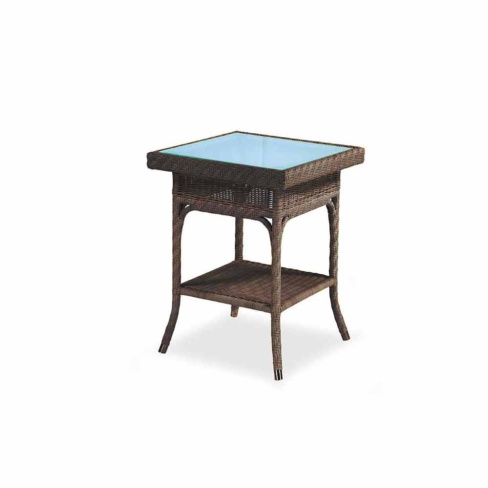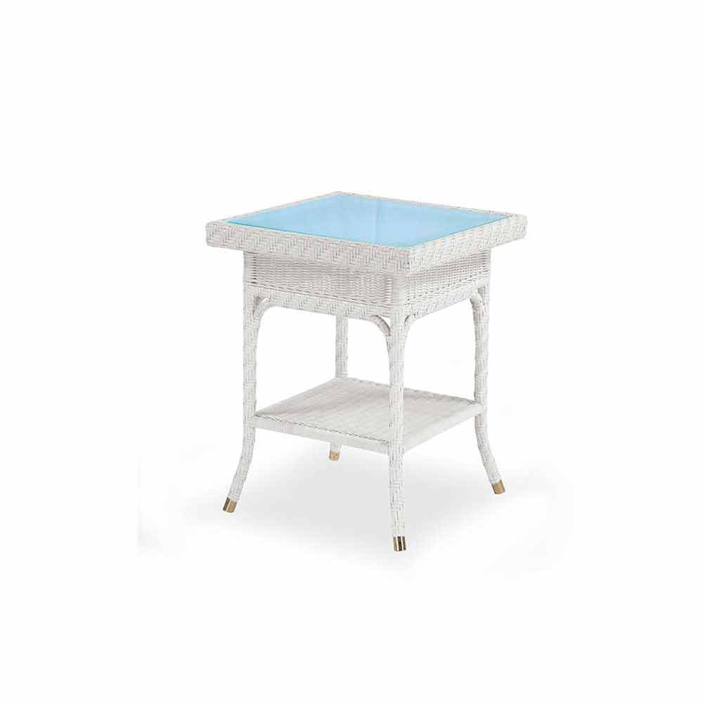 Denne tabel har en glasplade omkranset af en vævning i et sildebensmønster, som giver det en karakteristisk strejf af entydighed og en underliggende hylde.