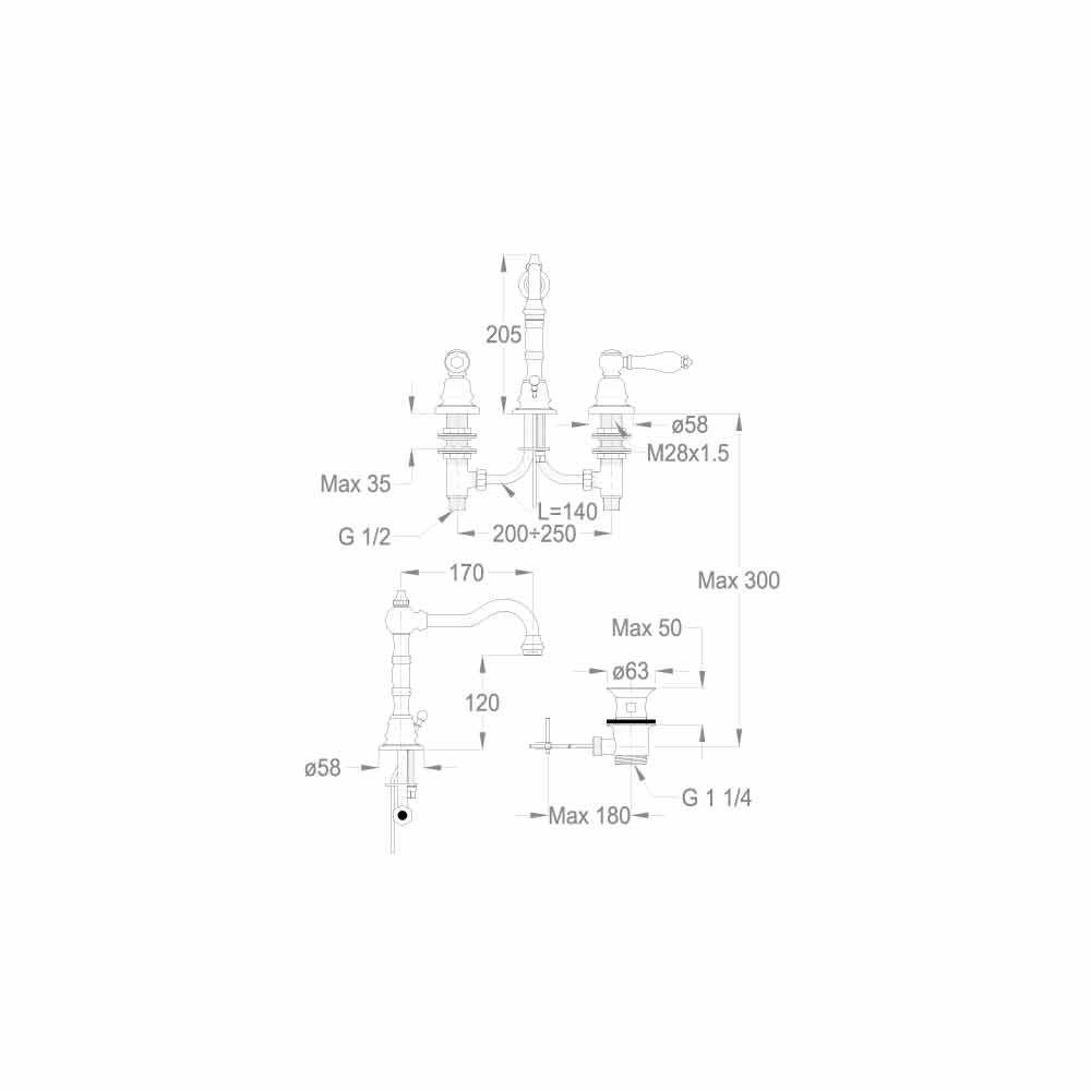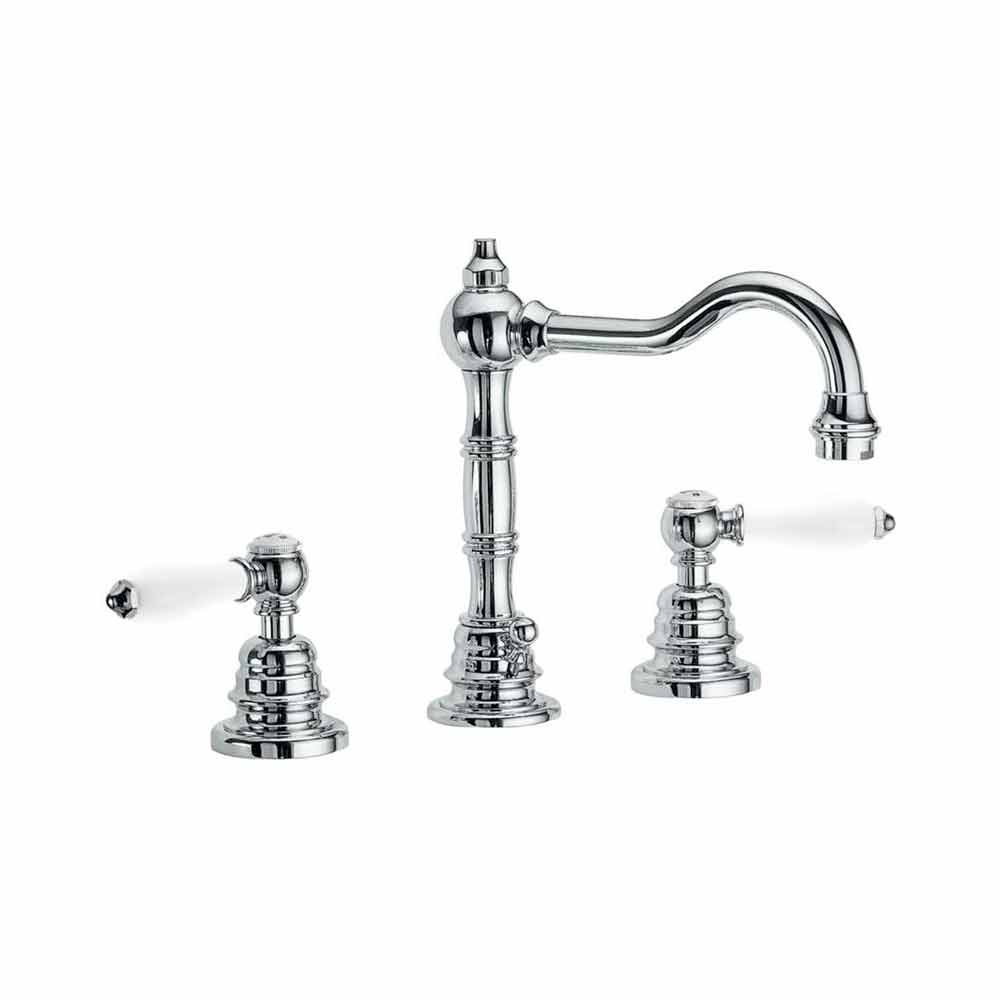 Bordvaskarmatur i messing i forkromet finish med et ekstremt klassisk design, 205 mm højt og med en centerafstand på 170 mm, komplet med afløb og pop-up-håndtag.