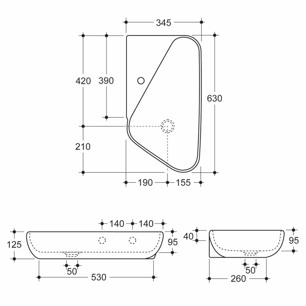 Designet håndvask med en trekantet håndvask, udstyret med en hylde til at rumme hanen og sæbe.