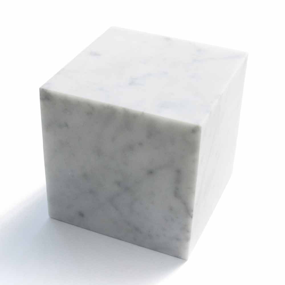 Terningens papirvægt lavet af hvid Carrara marmor . Det er et unikt stykke, da hver anvendt marmorblok adskiller sig fra de andre for vener og nuancer takket være håndværk fra professionelle specialiseret i marmorforarbejdning.