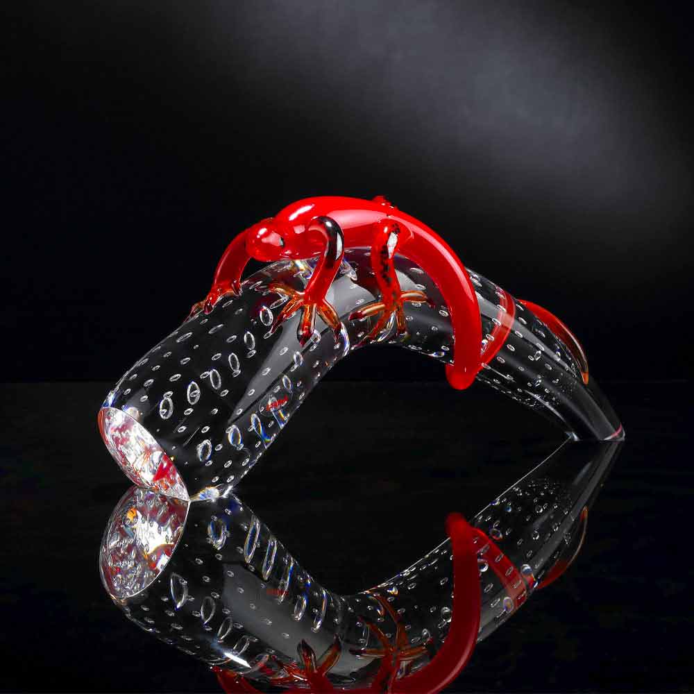 Ornament i form af en gecko på et horn lavet i Italien i rødt og gennemsigtigt glas . Et excentrisk dekorativt element til dit hjem, der er i stand til at give et originalt touch takket være sin stærke kreative personlighed . Dens usædvanlige og farverige æstetik repræsenterer utvivlsomt dets stærke punkt, hvilket gør det til en perfekt idé for dem, der elsker at berige hjemmemiljøerne på en original og elegant måde på samme tid takket være en genstand understreget af eksklusive linjer og den tidløse elegance af glasset og dens vidunderlige farver. Resultatet er et simpelt dekorativt tilbehør til hjemmet, der er i stand til at berige ethvert hjem med et strejf af farver takket være dets moderne sjæl og avantgarde design .