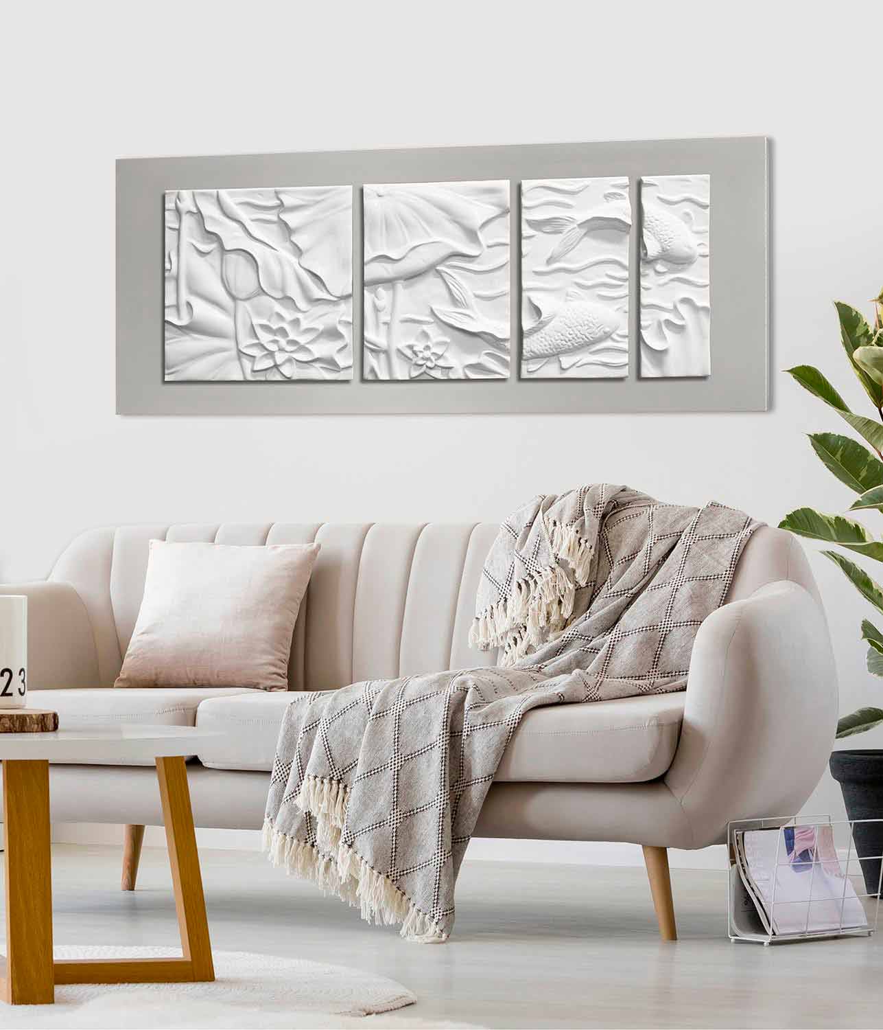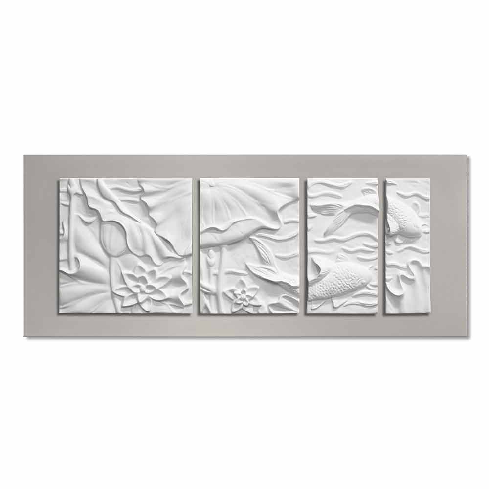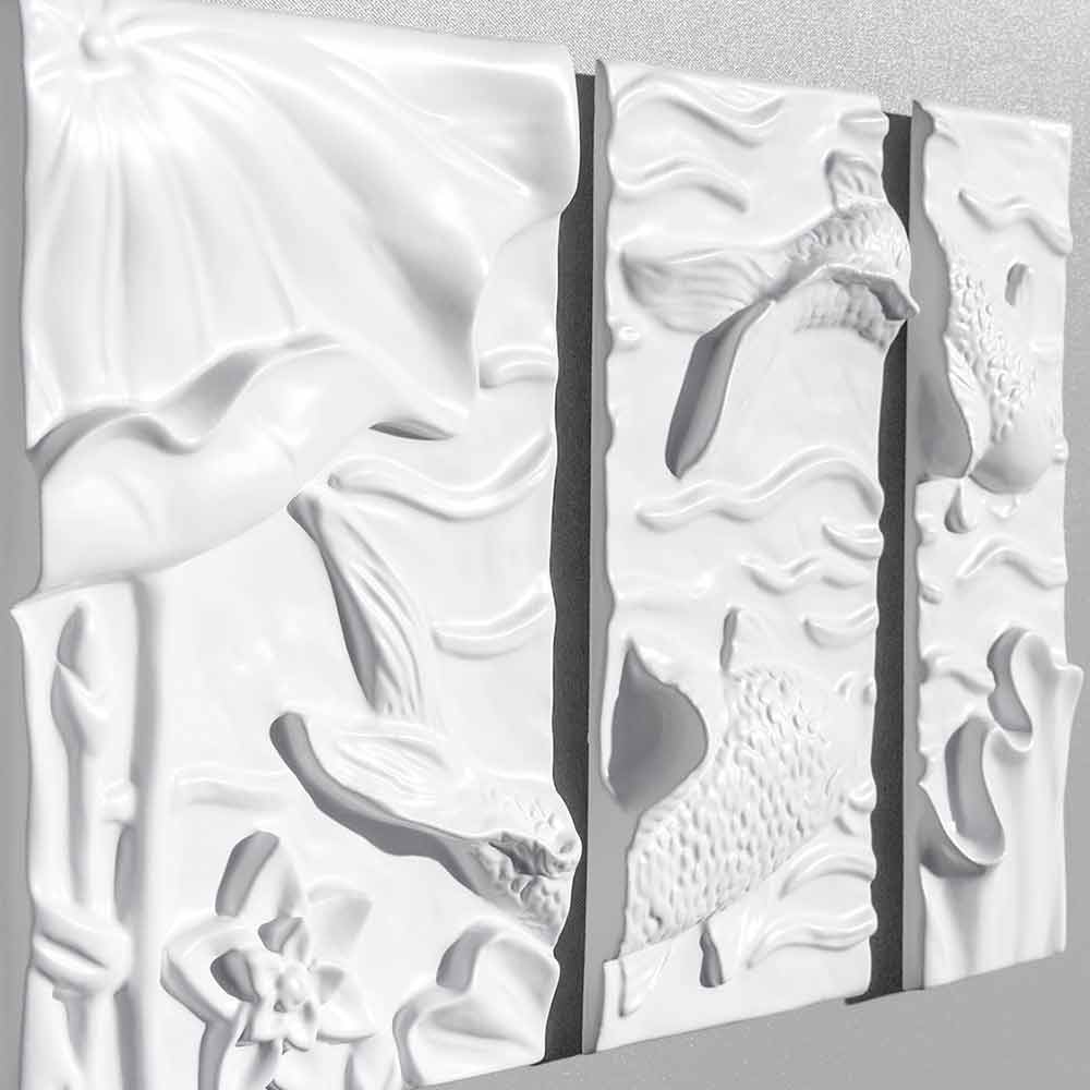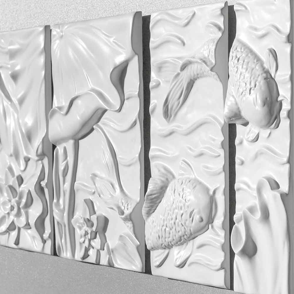 væginstallation i komposit keramisk består af fire elementer med elegante linjer og moderne former i elfenben hvid afbilder den japanske koikarpe monteret overhængende på silke grå lakeret lærred. Resultatet er med en minimal og dekorativ æstetisk påvirkning for en unik stil.