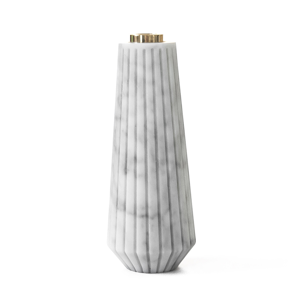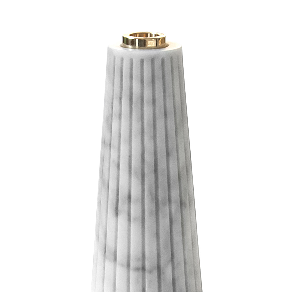Lille stribet lysestage i hvid Carrara marmor og messing, fremstillet i Italien.