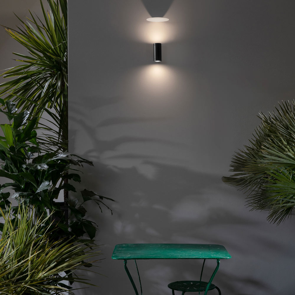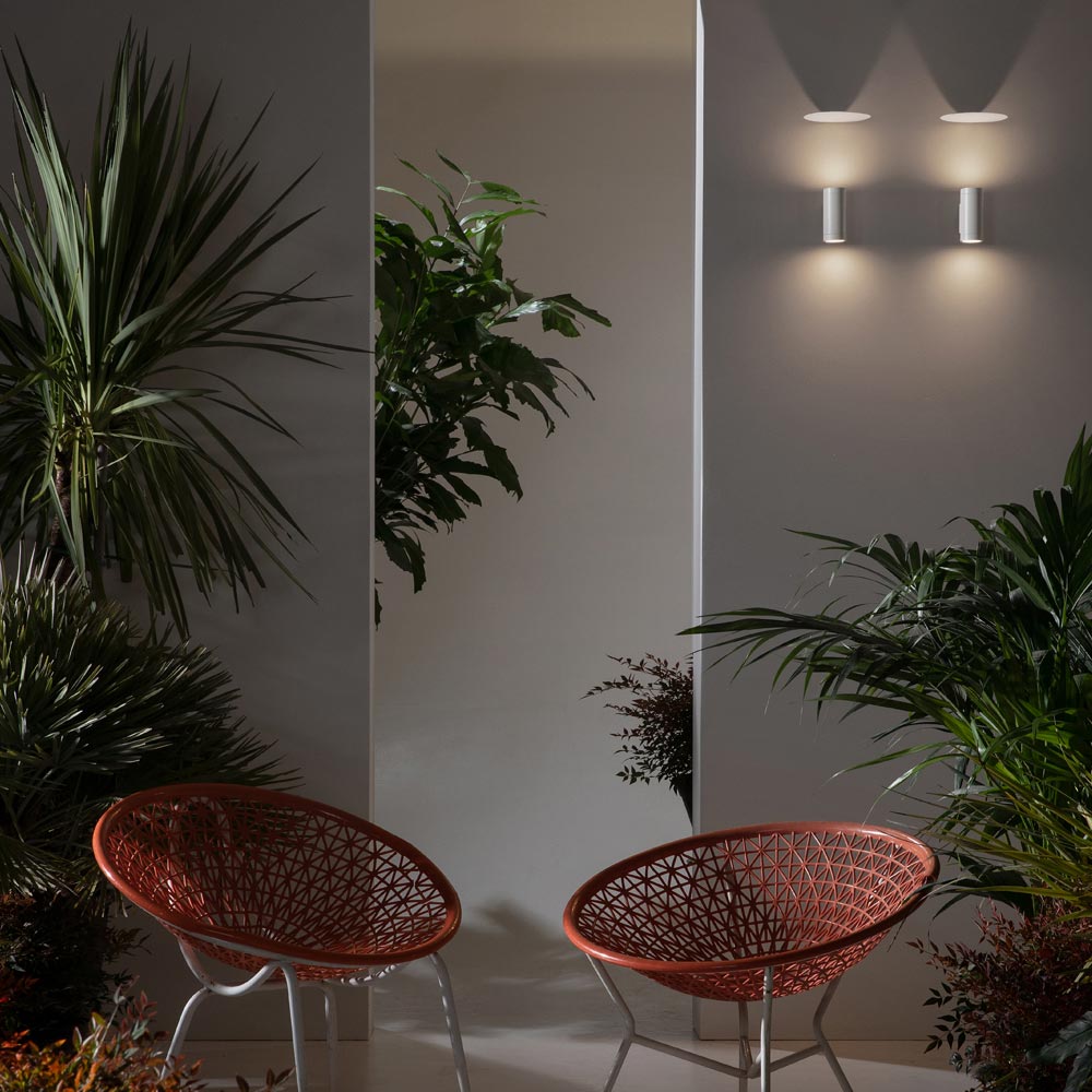 Denne originale og enestående udendørs væglampe har et moderne design , hvor lys og skygger spiller og giver liv til uventede refleksioner: Væggene begynder således at genoplive selv om aftenen med geometriske tegn, der falmer ind i mørket.