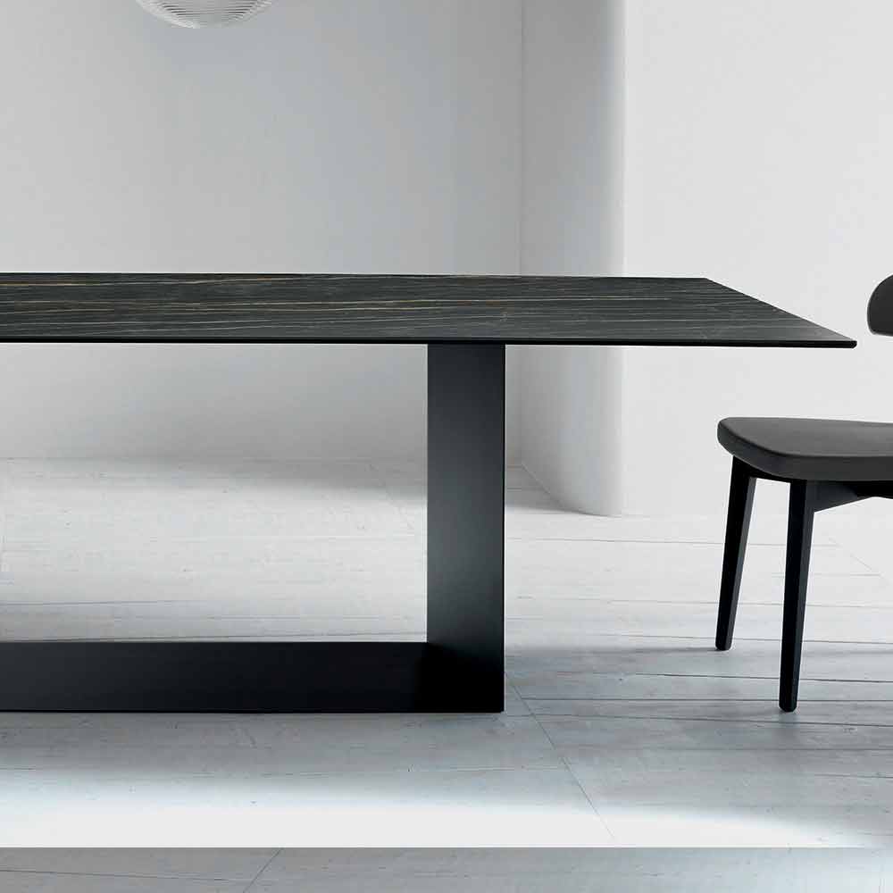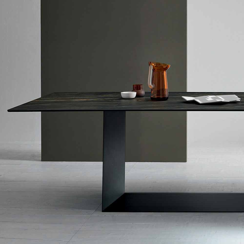 Levende designbord i mat Noir Desir keramik og bund i mat grafit sort eller børstet bronzemalet metal, fremstillet i Italien.