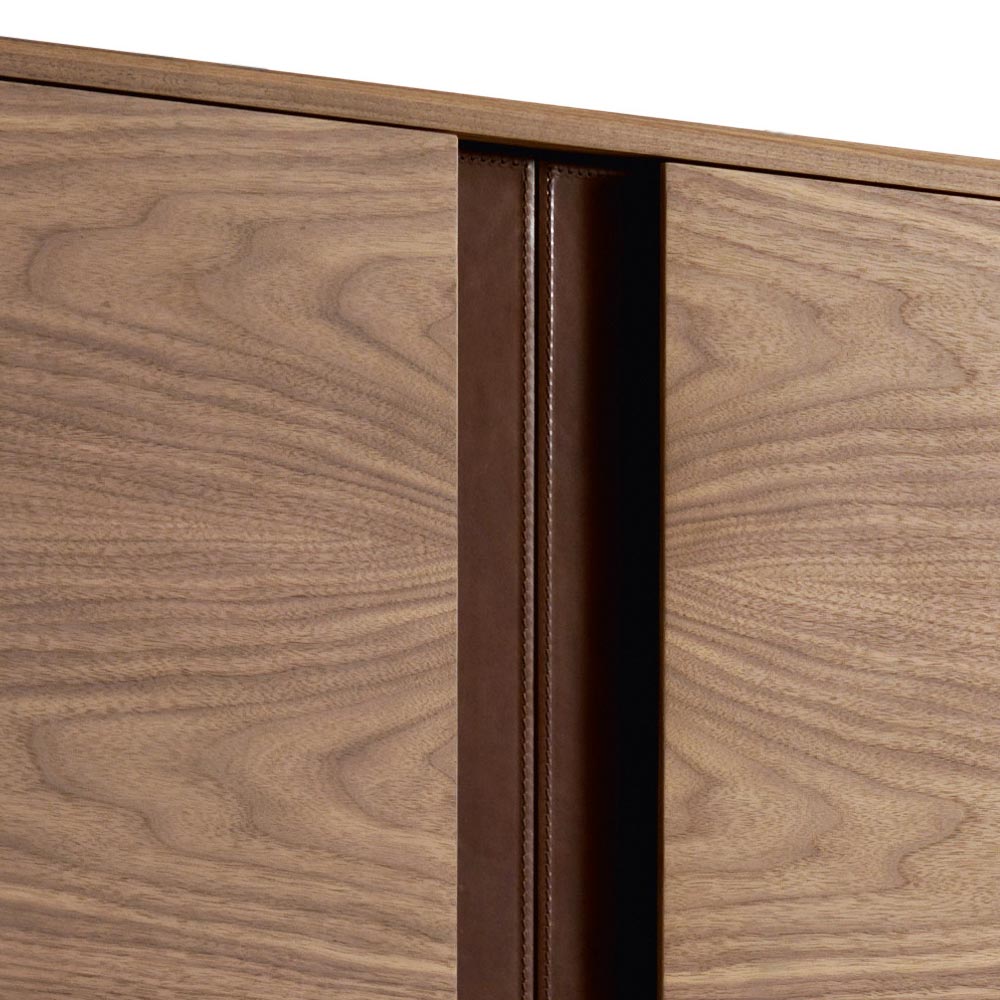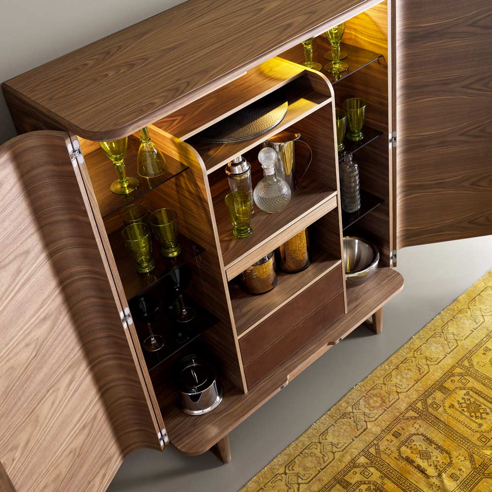 Inde i kabinettet finder du røget glashylder, udtræksservice og skuffer, udstyret med skjulte glidestyringer med det stille system; Forsiden og bunden af skufferne er dækket af naturlæder.
