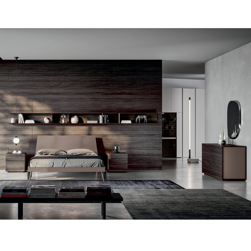 sober og raffineret stil karakteriserer denne sammensætning af møbler til soveområdet, ideel til dem, der leder efter et design, der er i stand til at berige og revolutionere rummets æstetik på en eksklusiv måde og med personlighed. Sengen, den ubestridte hovedperson i miljøet, fremstår som en livlig plet indsat i en enkel og samtidig unik kontekst, hvor finishene spiller i