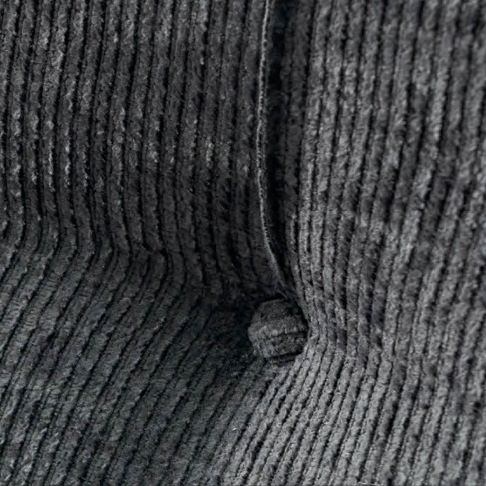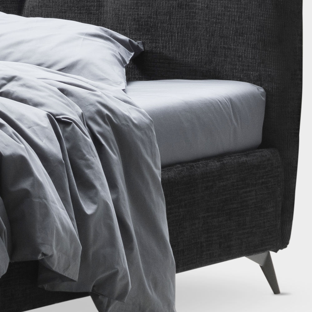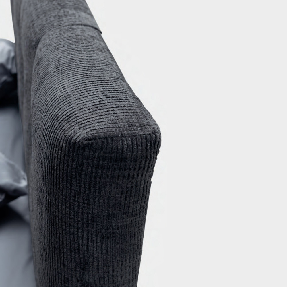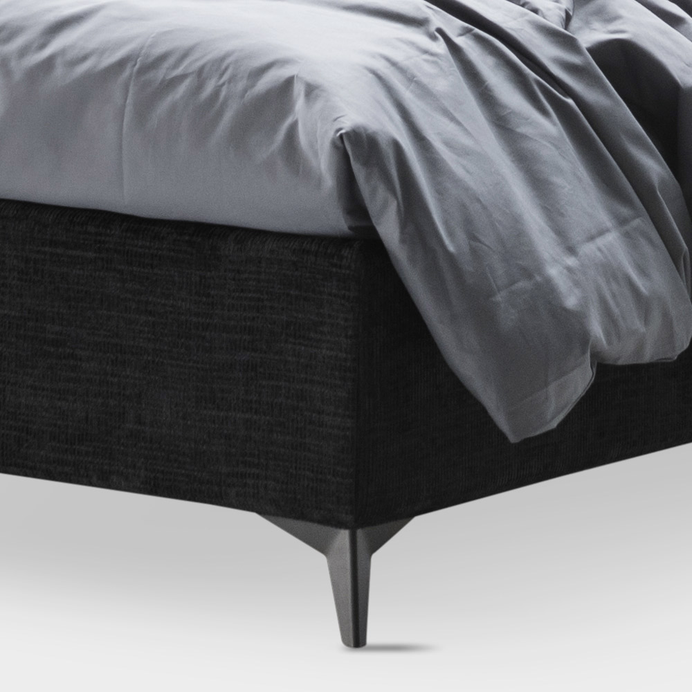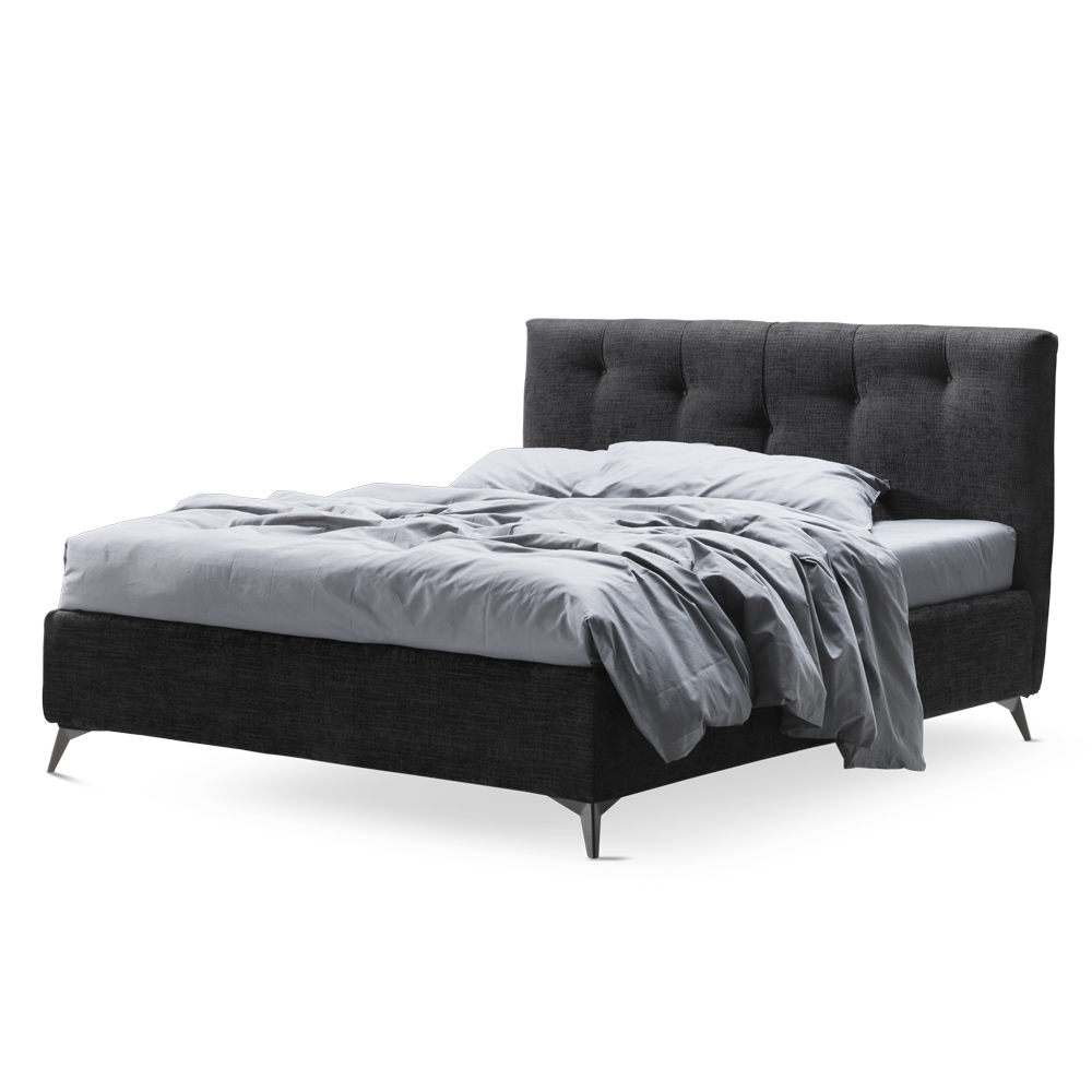 metalfødder i antracitfinish (højde 13,5 cm) og sengegavl karakteriseret ved prægede lodrette snore prydet med knappet quiltning.