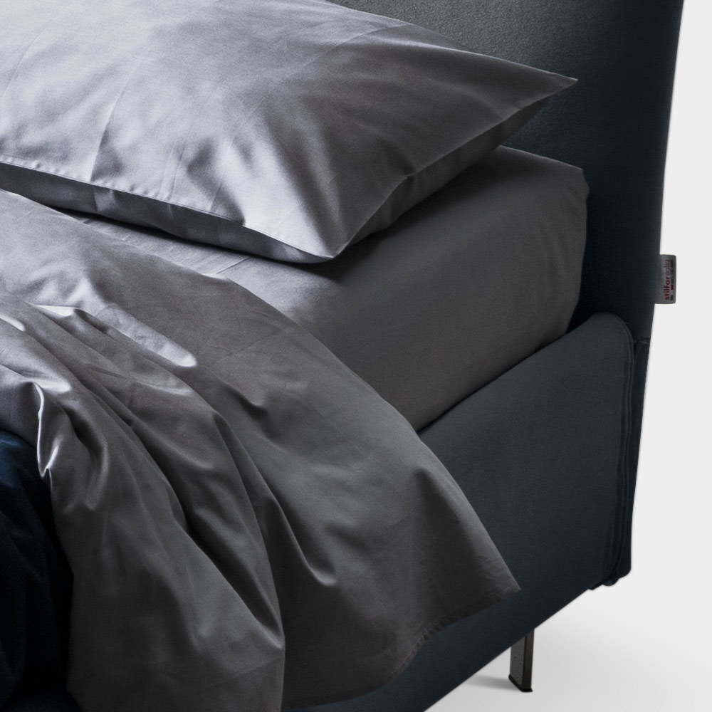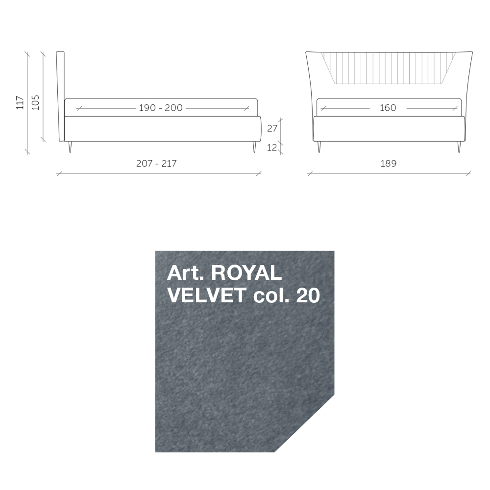 opbevaringsboks, metalfødder med poleret stålfinish (højde 12 cm) og sengegavl med et særligt og innovativt design: siderne har buede linjer, og den centrale del af sengegavlen er lavet med quiltede indsatser med brede lodrette lameller i brandsikkert stof.