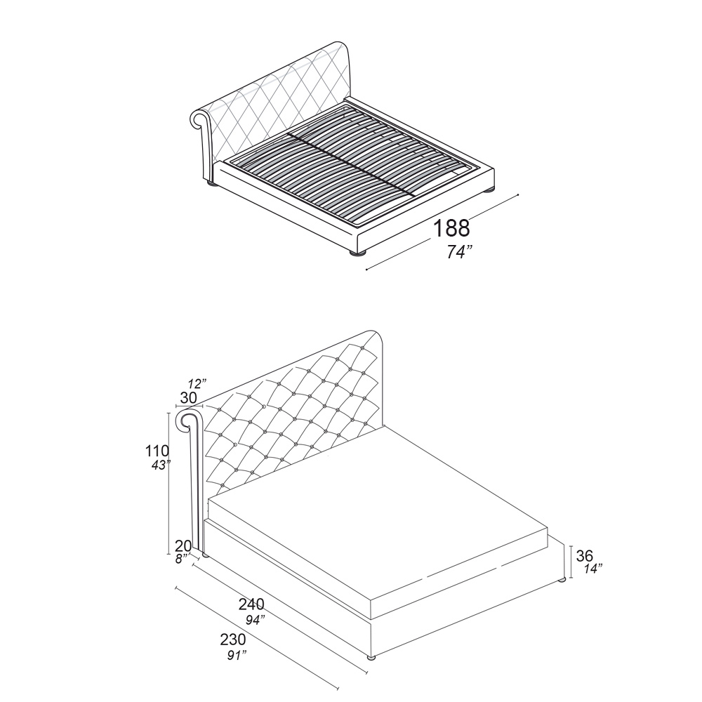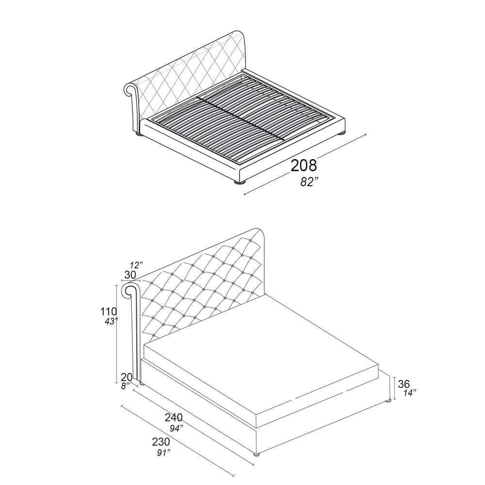 - længde: 208 cm x dybde: 240 cm x højde: 110 cm - velegnet til en 180x200 cm madras