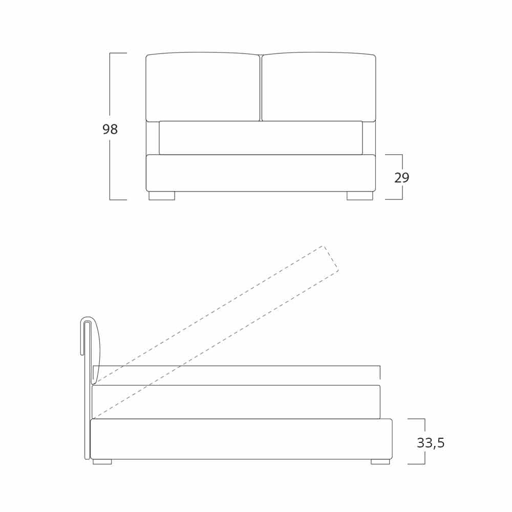 Struktur i grantræstrimler med naturlig indvendig finish h.29 cm, beklædt med polyurethanskum uden chlorfluorcarboner iht. UNI-standarder og foret med lysstabil velfodera. Bunden af strukturen er i træagglomerat med syntetisk indvendig finish med graneffekt, sidstnævnte er understøttet af PE og rørformede profiler. Lamelbund med metalstruktur, buet ramme med 50x37 mm profil malet med epoxypulver. Normal ortopædisk lamelbund, buede bøgekrydsfinerlameller.