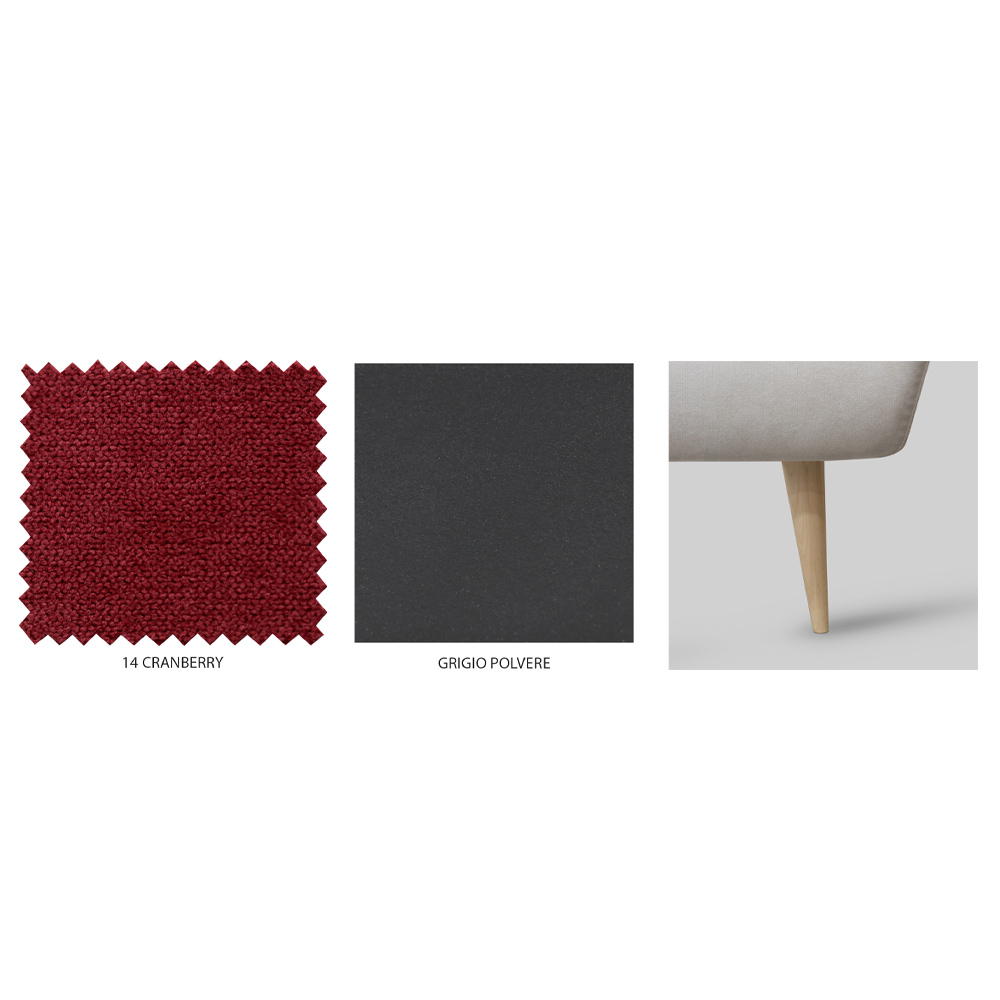 - H 25 fod model: puddergrå sengegavl, sengeramme i tranebærstof og naturlige træfødder