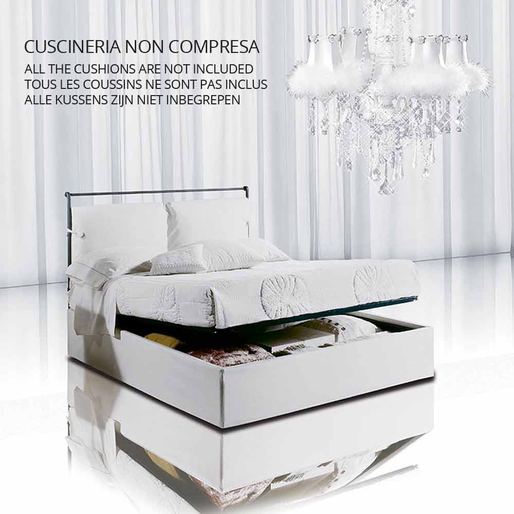 Smedejernssengen i varianten DOBBELT PENGÆDE MED FODGÆLDE OG CONTAINER inkluderer en lamelbund, der kan rumme en 160 x 190 cm madras. Basen vi leverer har et specielt madrasfastholdelsessystem, der gør at den også kan rumme en 190 cm lang madras. Hvis der er særlige æstetiske behov, kan denne model, takket være vores håndværksmæssige produktivitet, ændres i højden. Beholderen er udelukkende lavet af metal og kan males i enhver farve. At have en metalbeholder garanterer utallige fordele for vores seng, herunder soliditet, nem rengøring og større kapacitet. Beholderen kan under alle omstændigheder kombineres med en tekstilkappe. Denne version med fodplade kan for eksempel kun laves takket være beholderens metalstruktur, en meget velkommen kombination, fordi den giver dig mulighed for at kombinere klassicismen af en komplet seng med bekvemmeligheden ved at bruge opbevaringspladsen.
