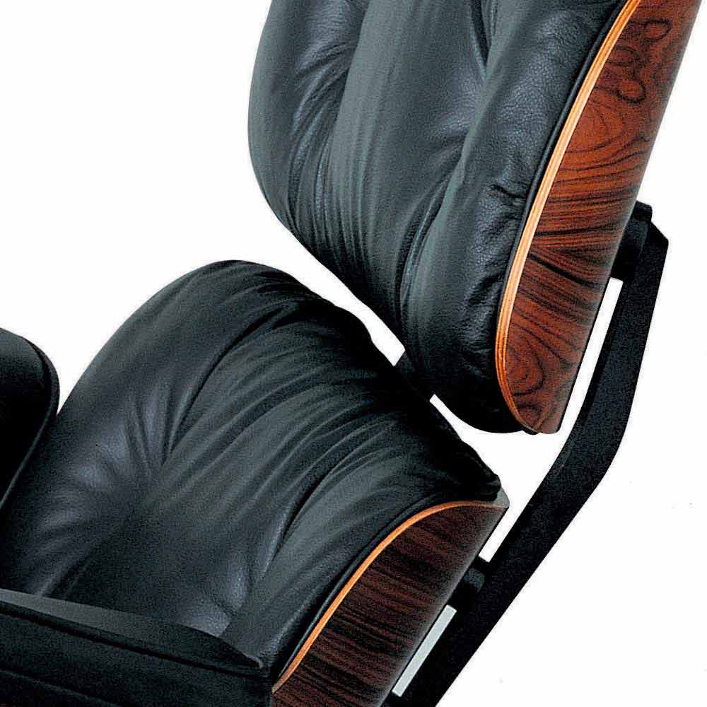 Drejelig lænestol helt fremstillet i Italien med aluminiumsbund, palisanderskal, polyurethanskum og polyesterfiberpuder og læderindtræk komplet med fodstøttepuf der matcher lænestolen. En idé om møbler, der i sig selv blander elegancen i de valgte materialer og funktionaliteten i dens udformninger, og tilbyder et