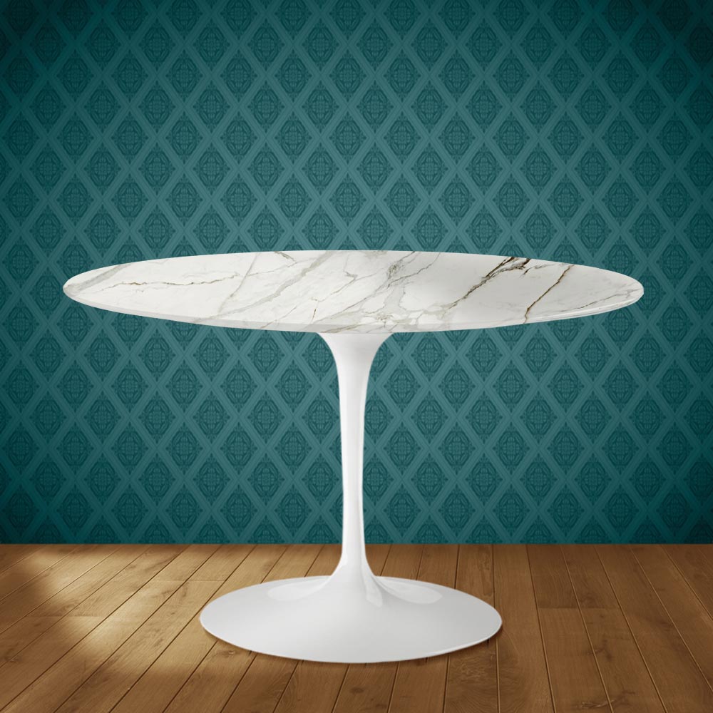 Spisebord med rund bordplade i poleret Dekton-keramik, blank Calacatta-marmorlook og poleret aluminiumsfod , fremstillet i Italien. De lineære og raffinerede finish skaber et møbel, der nemt passer ind i stuer og køkkener indrettet i en række forskellige stilarter. Kombinationen af poleret Dekton-keramik og poleret aluminium gør dette bord velegnet til enhver lejlighed og skaber et indbydende rum. Praktisk og funktionel karakter er nøgleordene til at beskrive dette produkt, uden at glemme den elegance, der tilbydes af den unikke farve og grafik på den polerede Dekton-keramik.