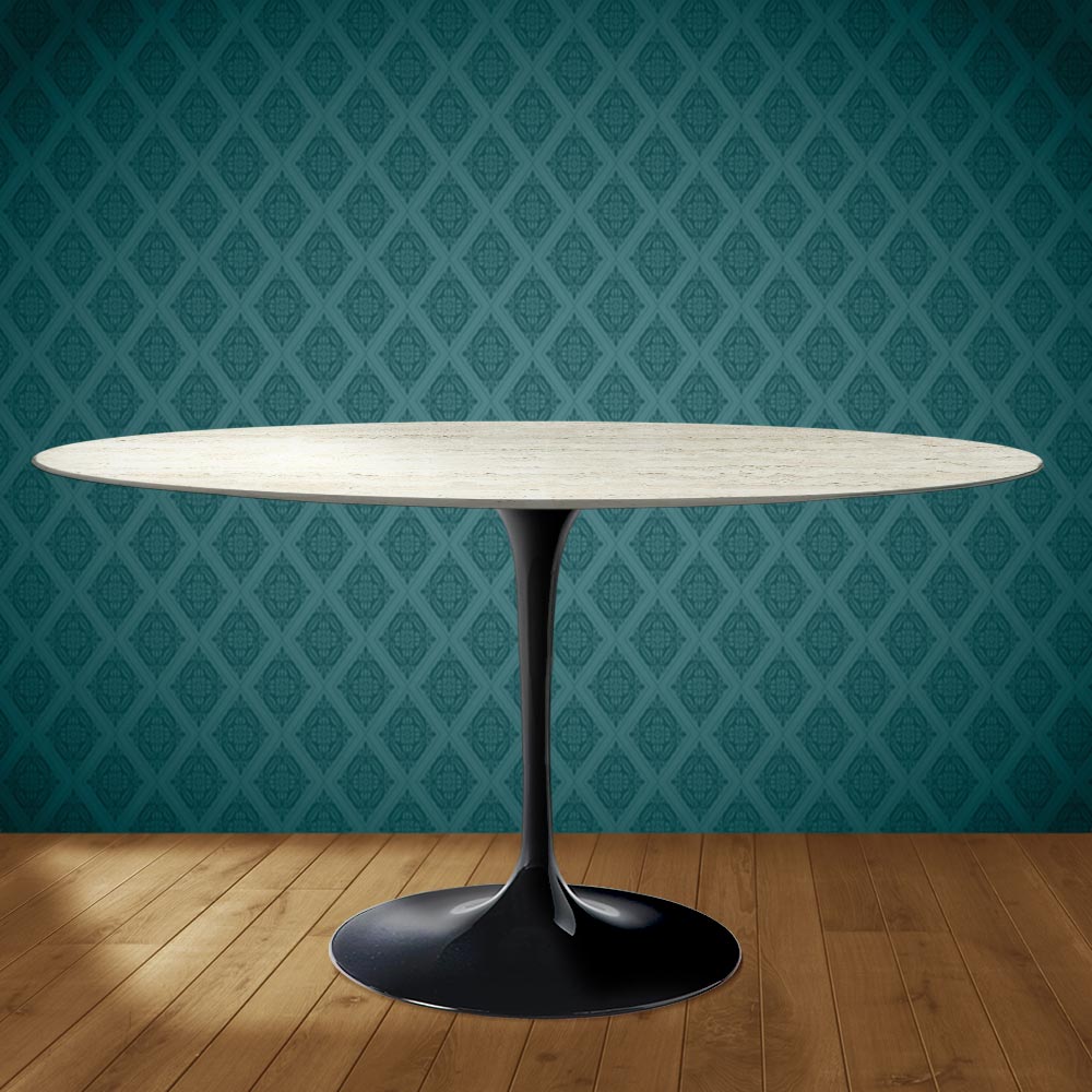 Spisebord med oval bordplade i Dekton Marmorio keramik med en mat travertin marmor effekt og en poleret aluminiumsbase , helt fremstillet i Italien. Dette bord har to funktioner, der gør det unikt: dets ovale form og Dekton Marmorio keramik. Den innovative ovale form er stadig mere populær til indretning af stuer og køkkener med originalitet, da den perfekt komplementerer en moderne og sofistikeret stil. De komplekse og sofistikerede grafikker og farver i Dekton Marmorio keramikken gør rummet til et varmt og indbydende sted, der garanterer funktionalitet og kvalitet, selv når det ældes. Dette bord er ideelt til dem, der ønsker at give deres rum en unik og uforglemmelig følelse.