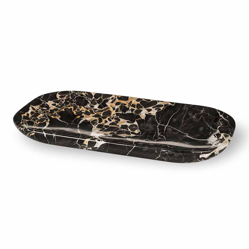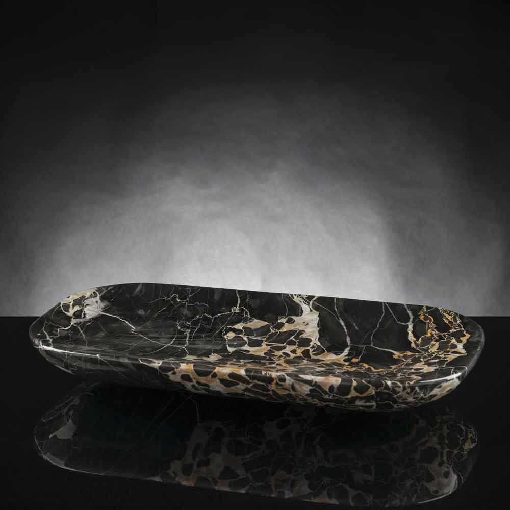 Dekorativ bakke helt lavet i Italien i Portoro marmor , et materiale, der gennem behandling af natursten gør det muligt at opnå mere komplekse former. Et objekt med iboende elegance, der opstår fra mødet mellem studiet af naturlige fænomener og interaktionen mellem forskellige materialer og de teknologier, som mennesket bruger. Resultatet er et sofistikeret møbleringstilbehør, der kan berige ethvert spisebord eller område af huset, så det kan bruges som en rigtig bakke, men også som en lommetømmer eller som et simpelt dekorativt element, der kan give møblerne et ekstra touch takket være marmorens tidløse elegance og dens vidunderlige årer.