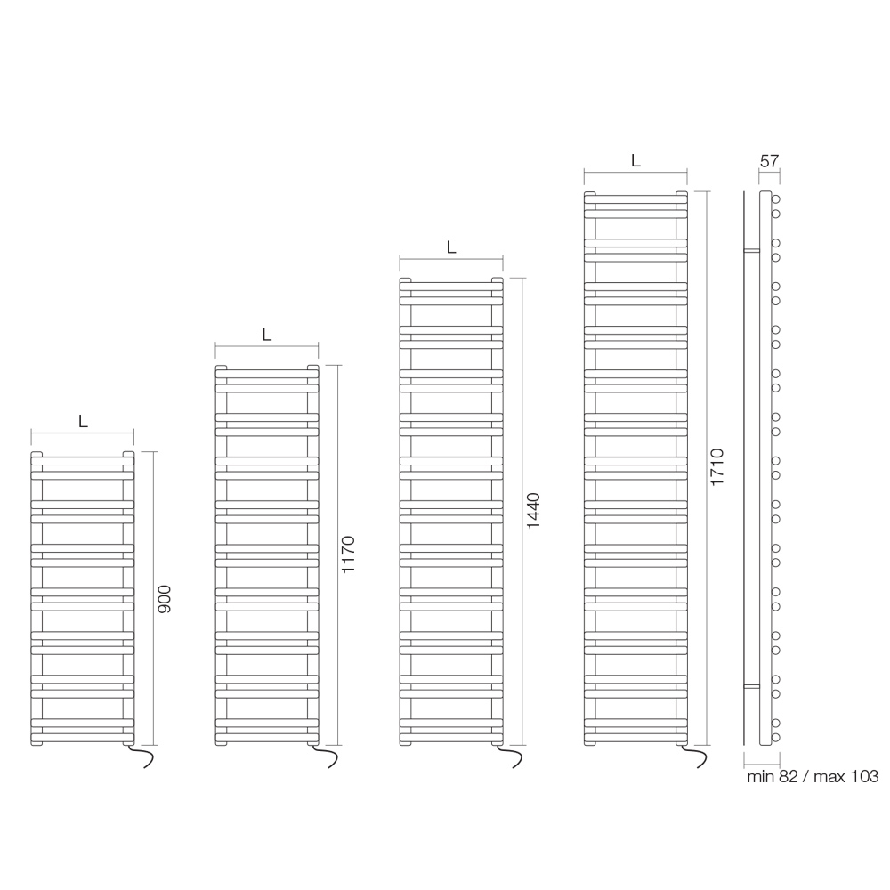 - Længde 60 cm – Dybde 8,2 cm – Højde 171 cm – Effekt 900 watt
