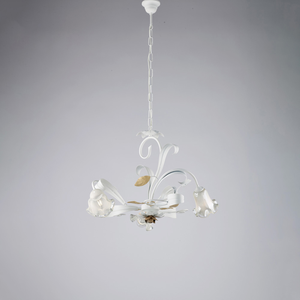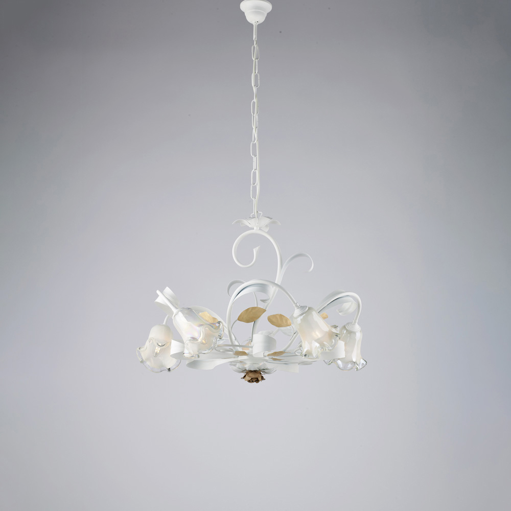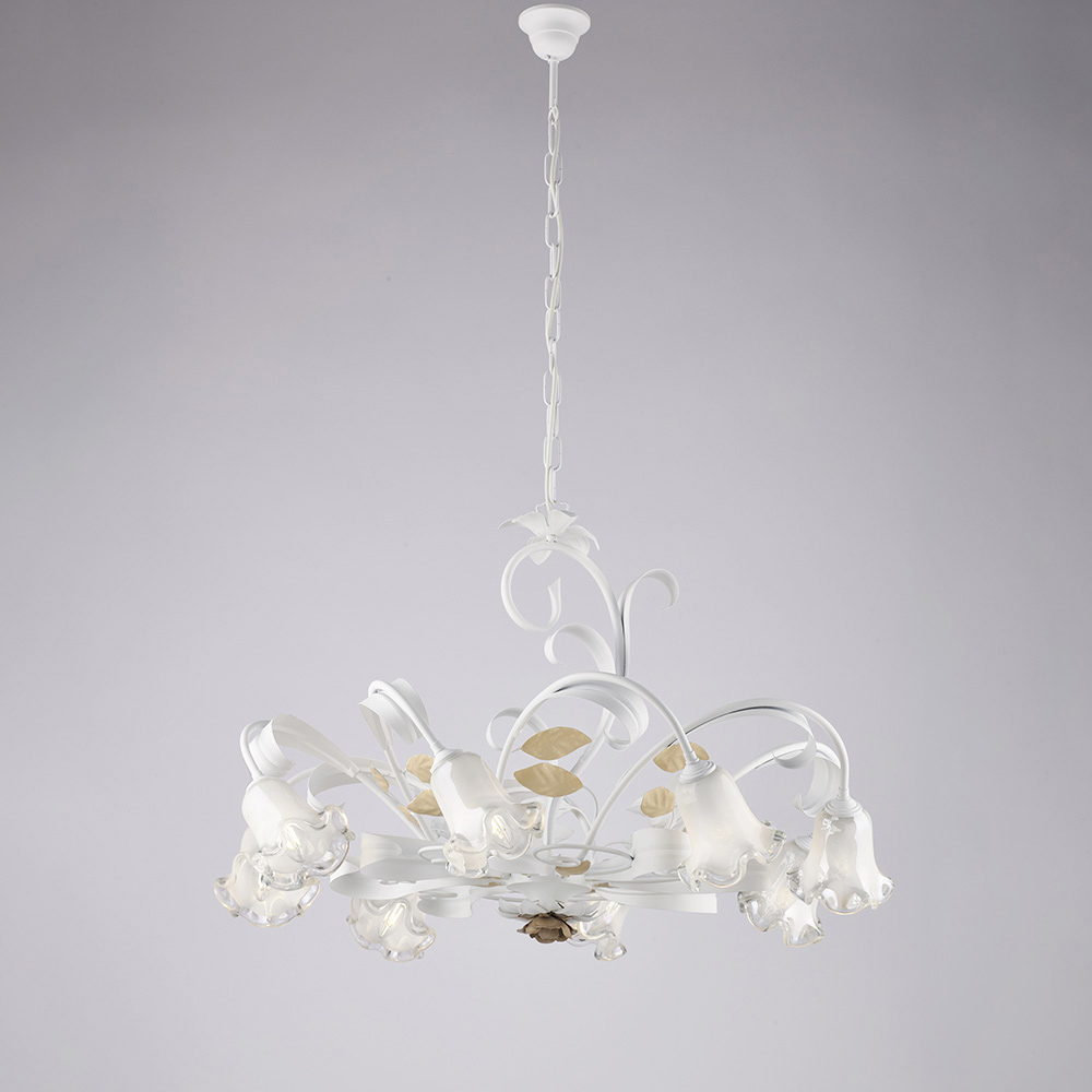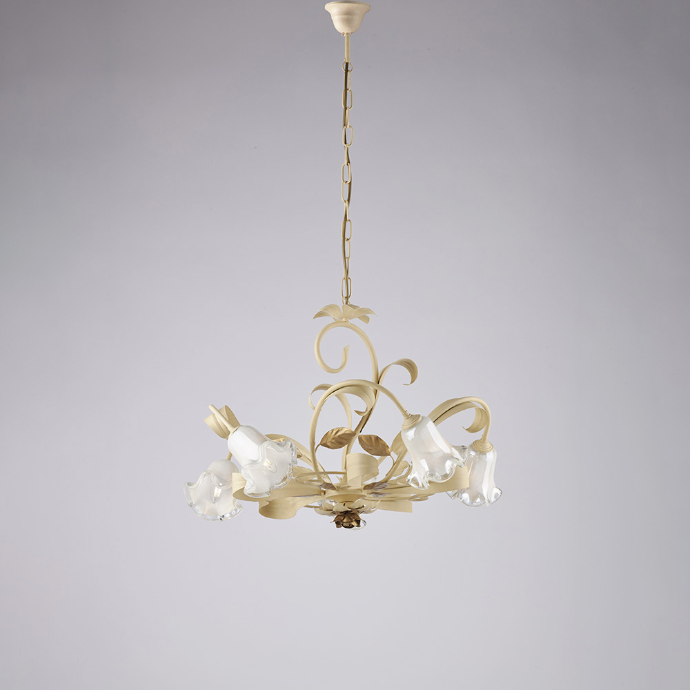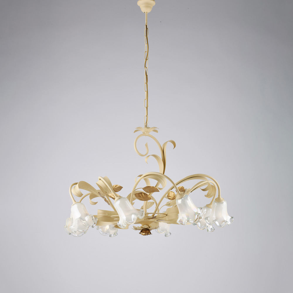 Denne klassiske lysekrone, håndlavet i elfenbenslakeret jern, er romantisk og elegant, og er en lysende kreation, der minder om charmen fra italiensk tradition, genfortolket med raffineret smag. Den bugtede struktur, beriget med dekorative krøller og en blomsterformet glasskærm , giver lethed og harmoni til den samlede effekt og skaber en varm og indbydende atmosfære.