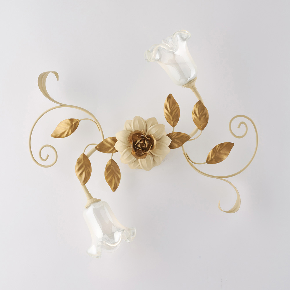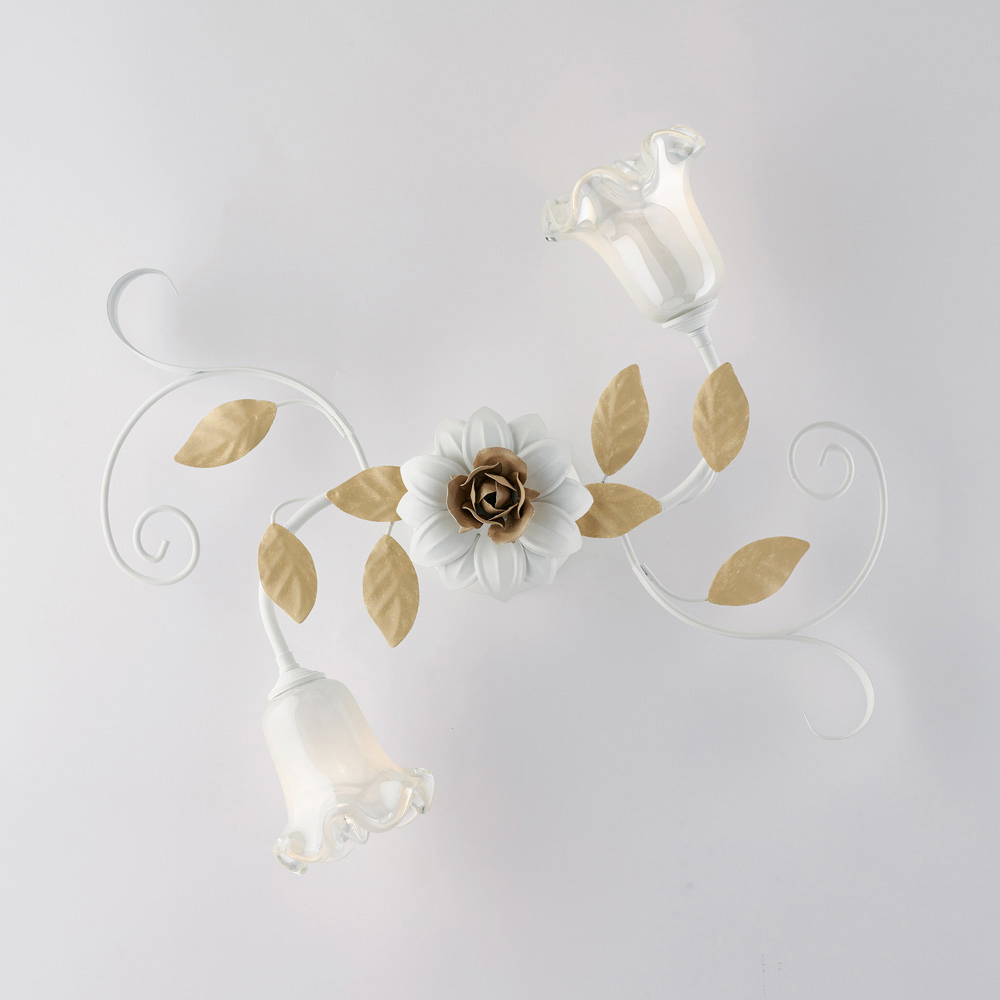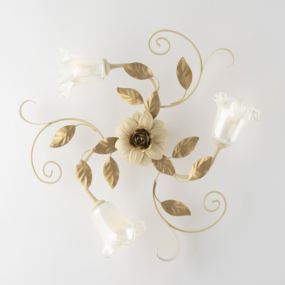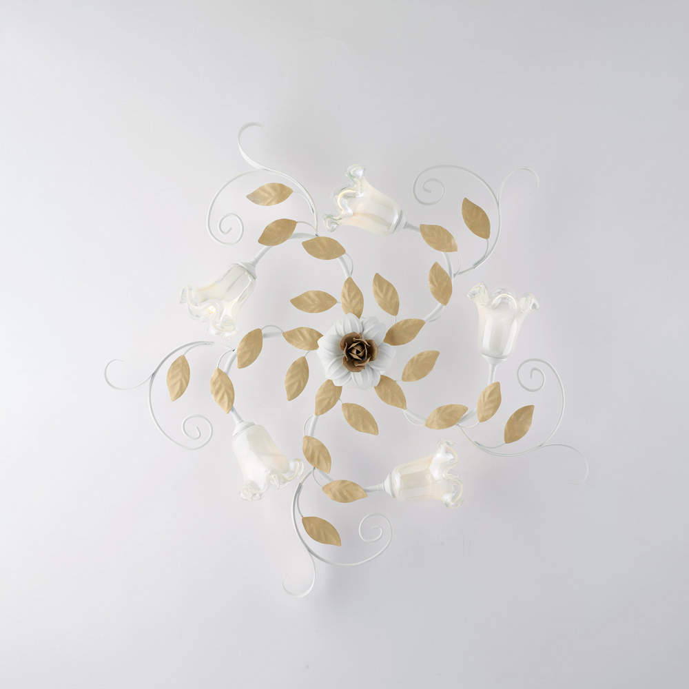 Denne klassiske håndlavede loftlampe i elfenbenslakeret jern er raffineret og dekorativ og er en lysende kreation med en stærk romantisk karakter. Blomsterstrukturen, udsmykket med bugtede krøller, dekorative blade og blomsterformede glasdiffusorer , giver loftet en let og harmonisk elegance og forvandler lyset til et ægte dekorativt element.