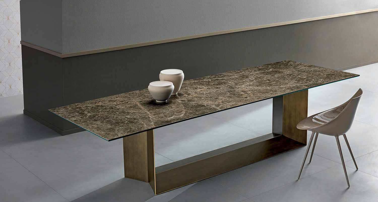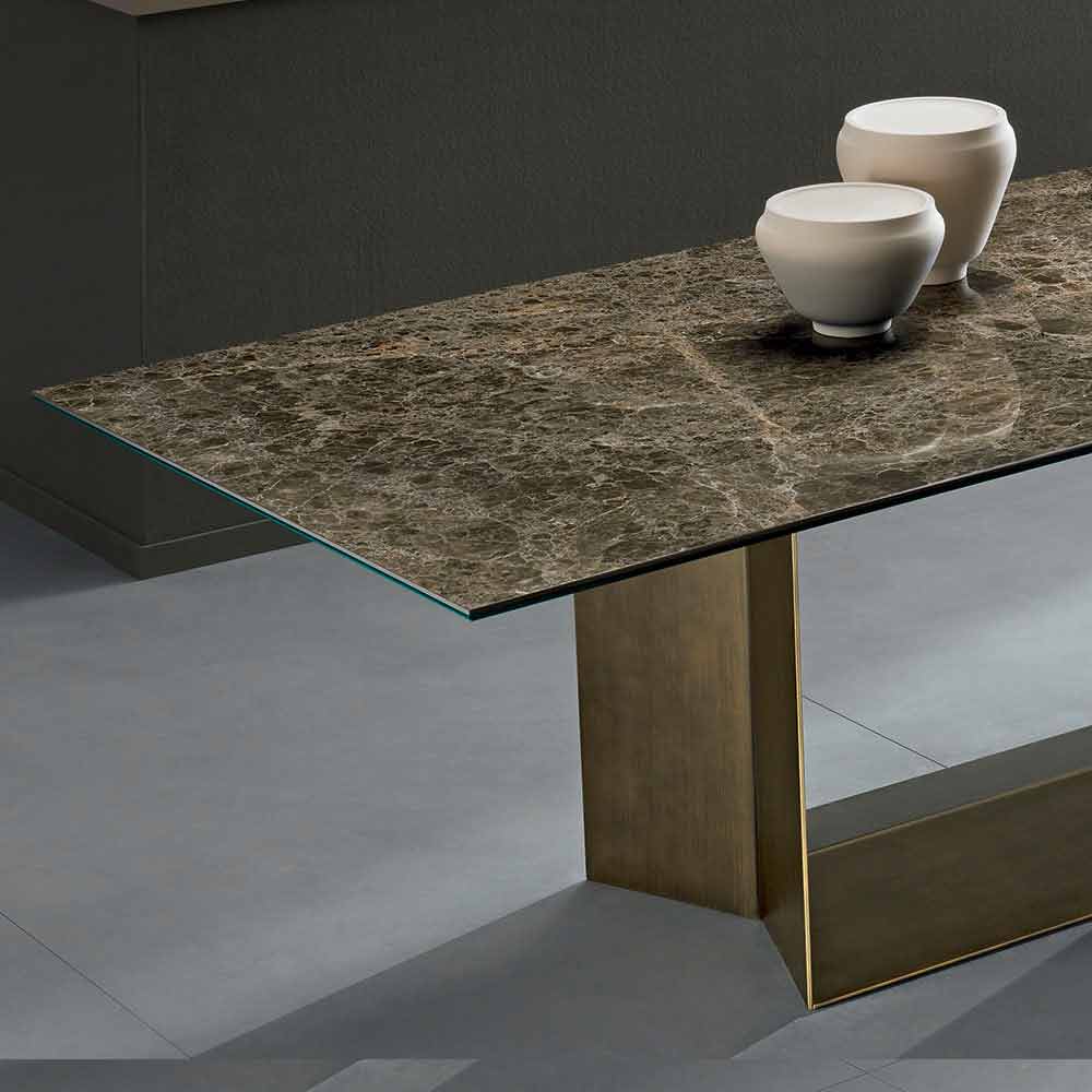 Luksus køkkenbord med poleret Emperador keramisk top og børstet bronze metalbund, fremstillet i Italien.