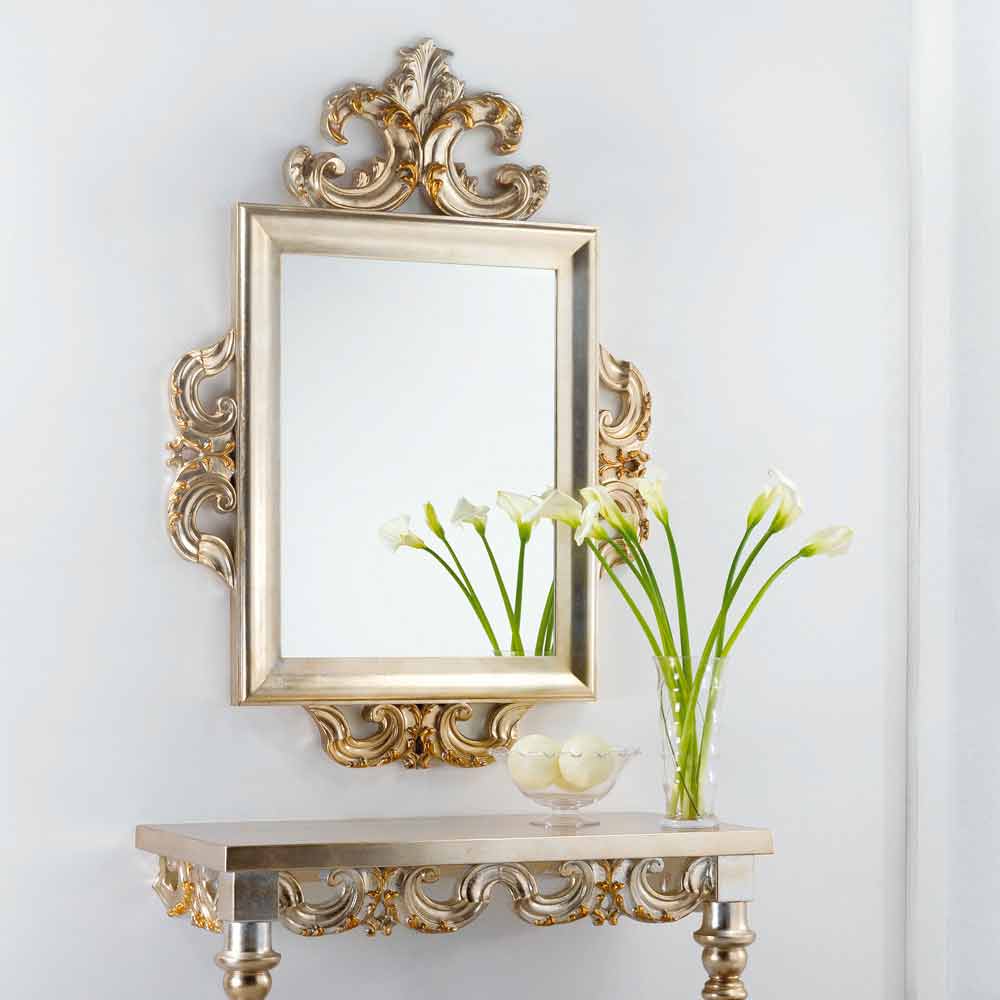 Spejlet Guy er kendetegnet ved en håndværksmæssig udført ved anvendelse af materialer af høj kvalitet og brug oplevelsen af faglærte italienske håndværkere. Rammen er lavet af træ dekoreret med udskæringer. Sølv blad færdig mekka. Spejlglas, 4mm tykt. Made in Italy.