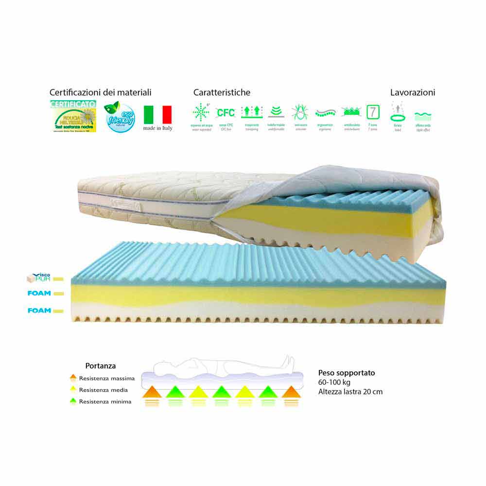 Lagene, formerne, de 7 differentierede zoner er designet til at garantere den naturlige hvileposition, hvilket gør det muligt for rygsøjlen altid at bevare sin ideelle konformation.