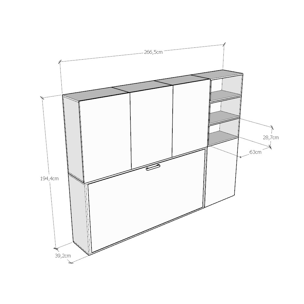- SAMMENSÆTNING B : enkeltseng integreret i en reol/garderobe med ni rum (fem med døre, hver med en indvendig hylde og fire åbne rum) - Lukket seng mod væggen: 266,5 x 39,2 x højde 226,7 cm / Åben seng: 266,5 x 106 x højde 226,7 cm