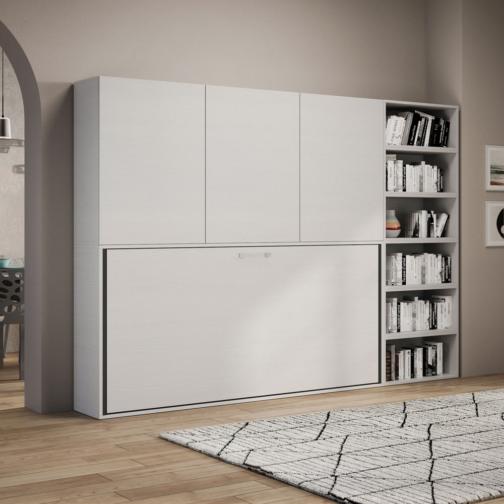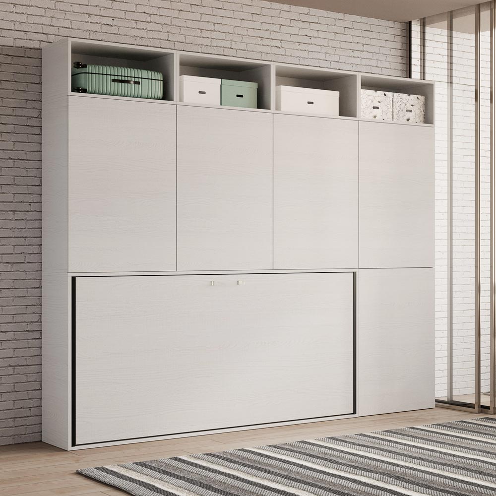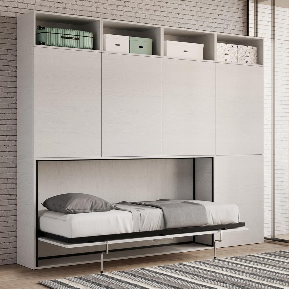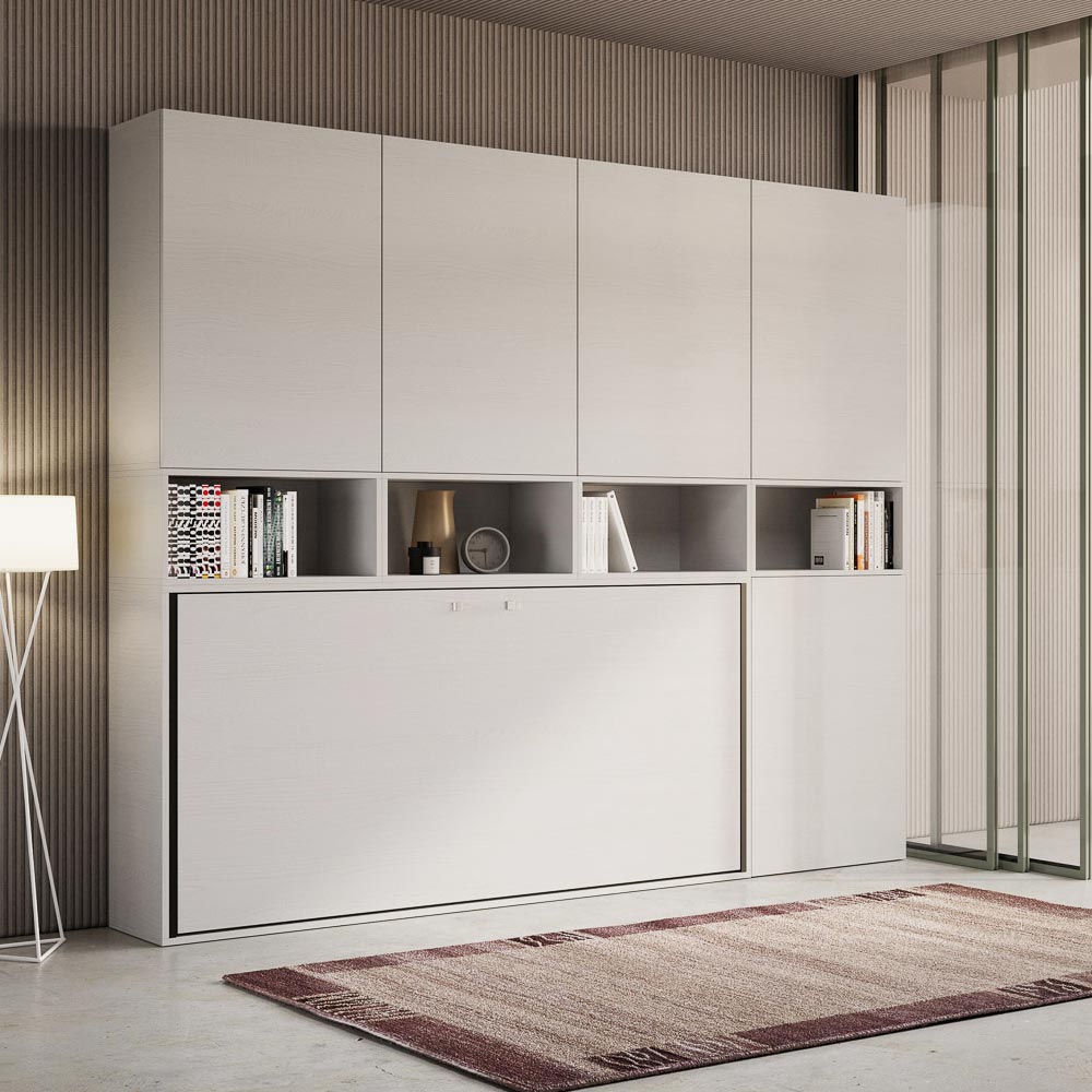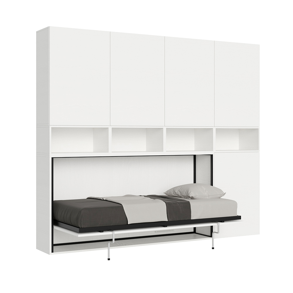 - SAMMENSÆTNING D : enkeltseng, der er skjult i et klædeskab med tre rum (hver med en indvendig hylde) med dør - Seng lukket til væggen: 199,9 x 39,2 x højde 194,4 cm / Åben seng: 199,9 x 106 x højde 194,4 cm