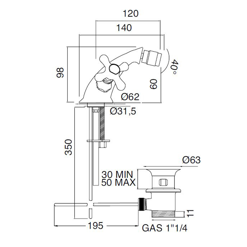 En-huls bidetarmatur med håndlavet messingskyl fremstillet i Italien.