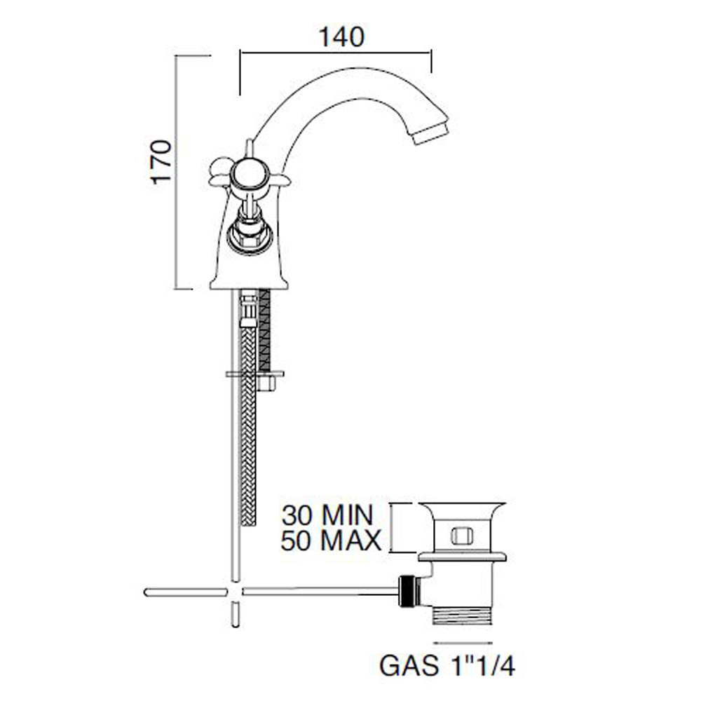Håndvaskarmatur med et enkelt hul håndlavet messing i klassisk stil fremstillet i Italien.