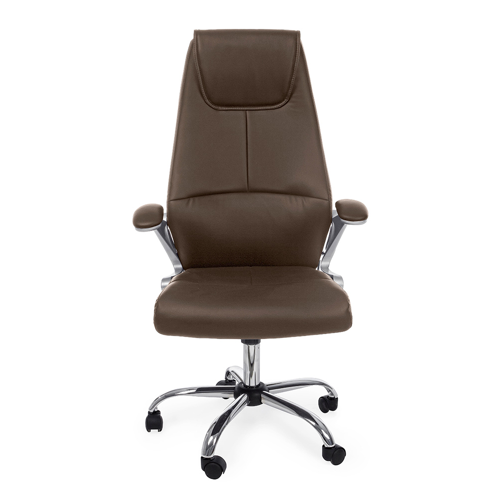 Ergonomisk kontorlænestol i stål med armlæn og sort eller brunt imiteret læder.