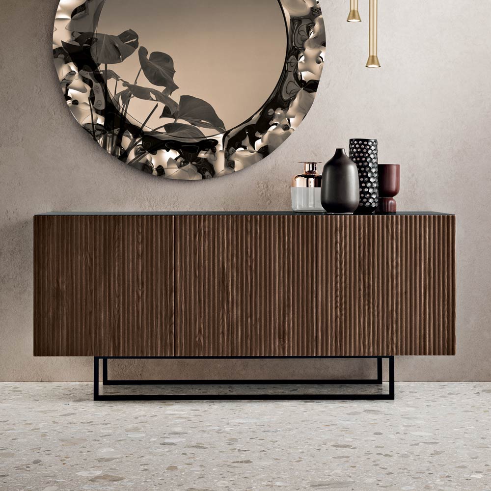 Strukturen fuldendes af en malet metalbase , der fås i forskellige konfigurationer, som giver møblet visuel lethed og momentum og opretholder en perfekt balance mellem soliditet og elegance.