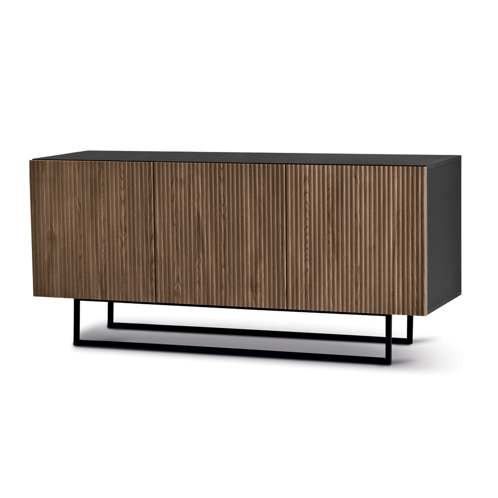Den antracitfarvede melaminbelagte karosseri huser PVC-belagte MDF-døre, der er udsmykket med en hævet lodret stribe , hvilket skaber en elegant ribbet effekt . Denne detalje giver dybde og rytme til kompositionen og fremhæver lys- og skyggespillet på overfladen.