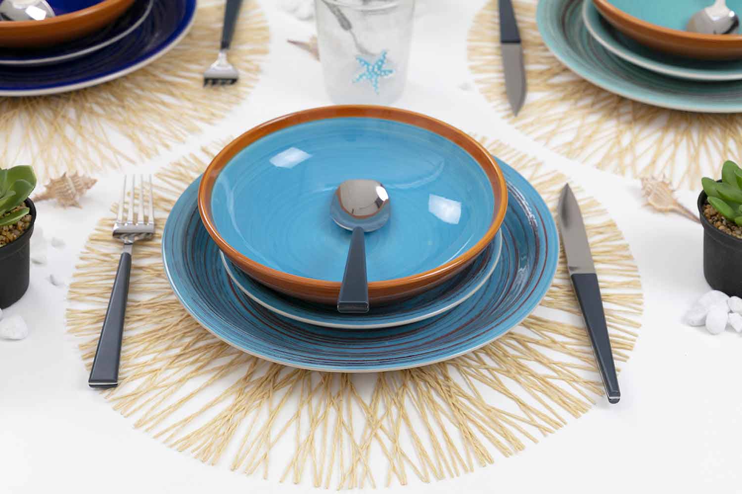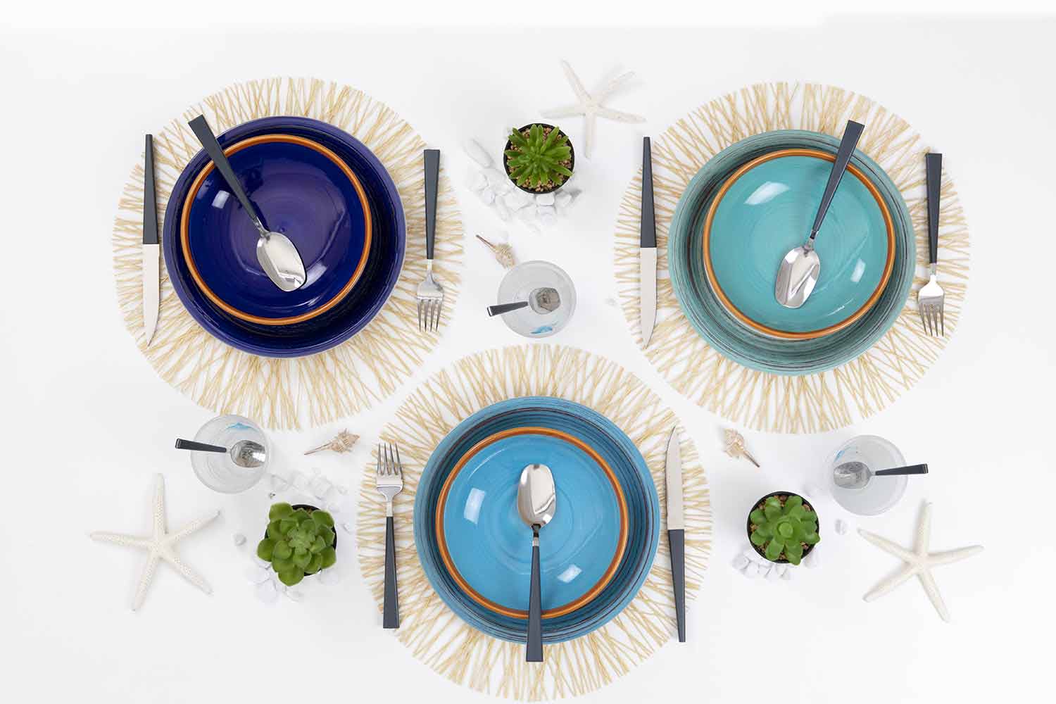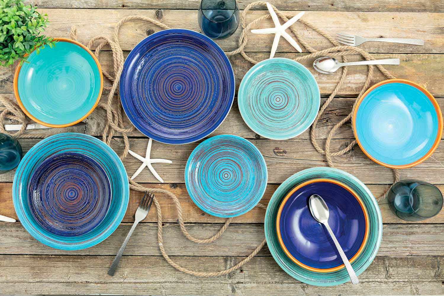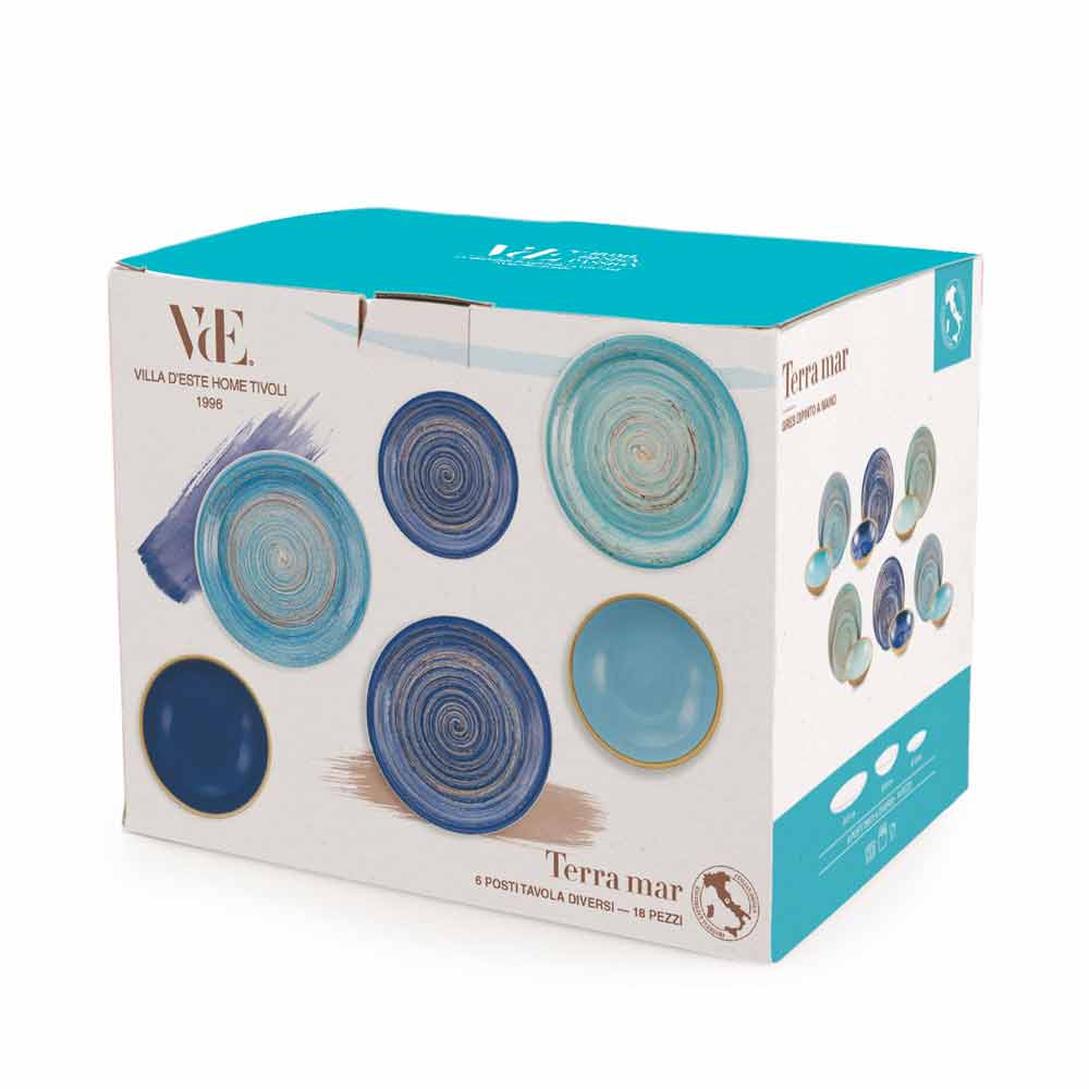 Denne tjeneste henter inspiration fra Egadi-øerne i Middelhavet, især fra øen Favignana, dronning af øhavet for sin uberørte skønhed og dens farver, der vises på pladerne, hvor det blå af havet med dets nuancer skærer hinanden med venerne på beige minder om hvidt og varmt sand.
