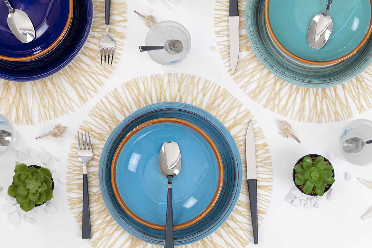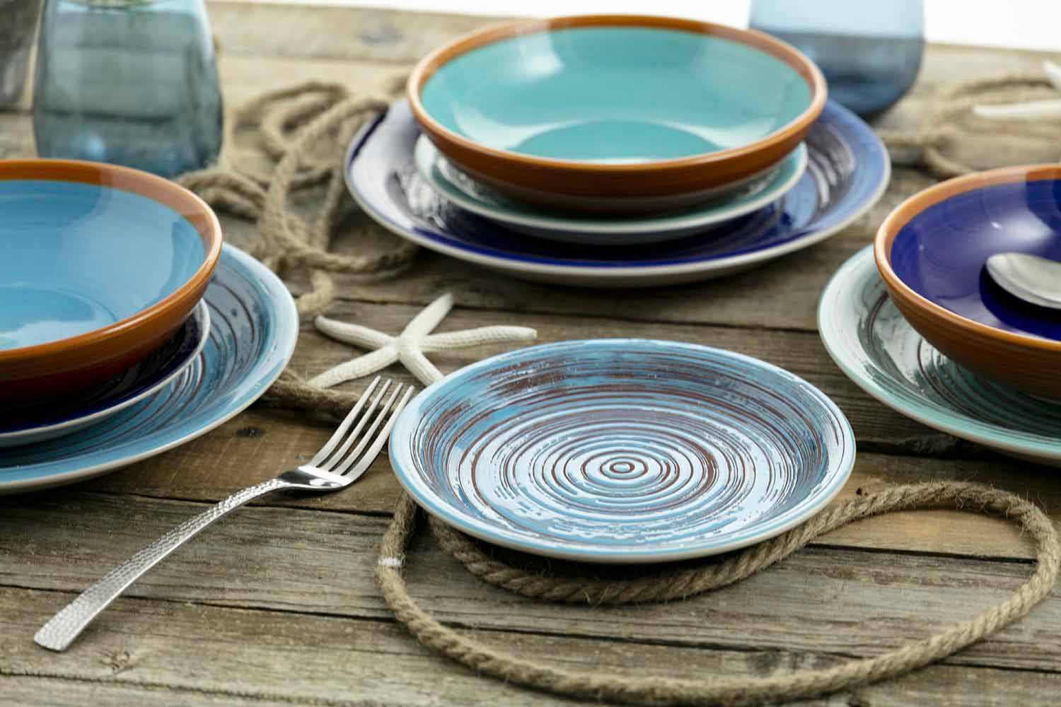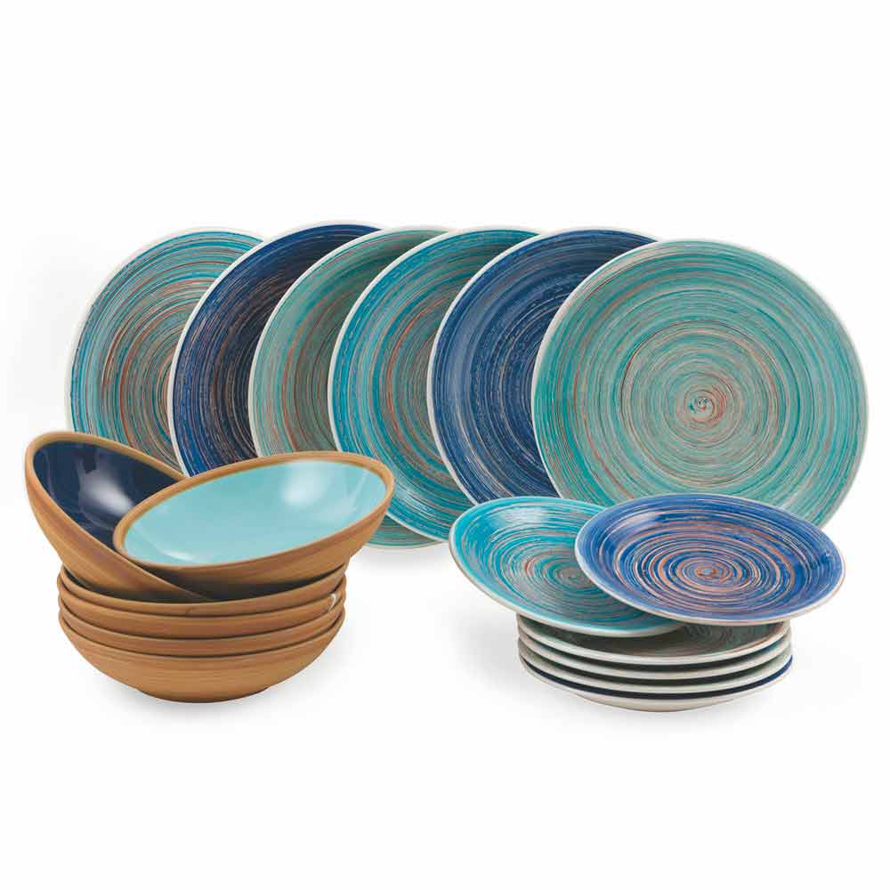 Farverige og moderne 18-delt stentøjsretter, komplet bordservice.