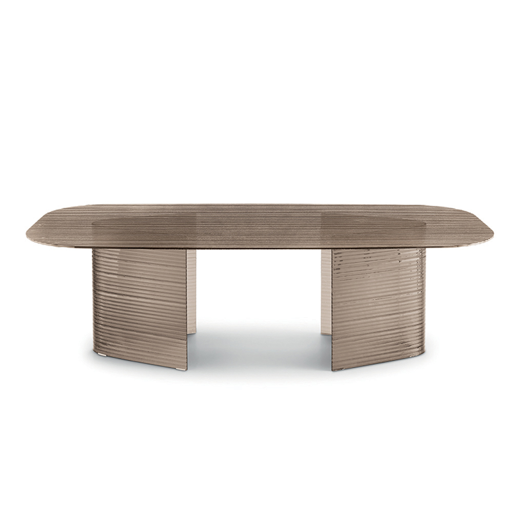 Den karakteristiske base, der består af to buede elementer, skaber en skulpturel og dynamisk struktur, der bliver bordets sande hovedperson. Glassets gennemsigtighed fremhæver designet og holder rummene visuelt lyse, hvilket gør det perfekt til moderne og elegante omgivelser.