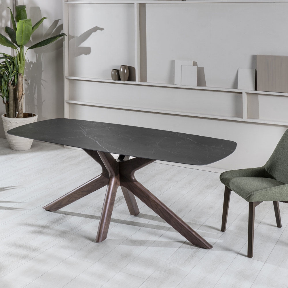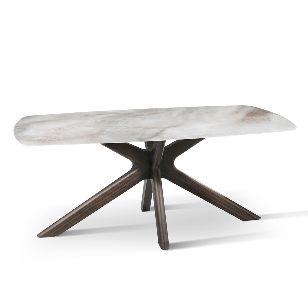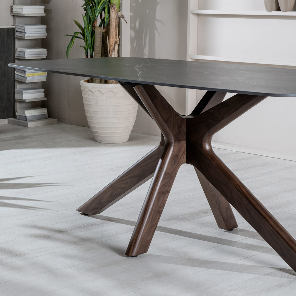 Det er et raffineret og originalt bord, hvor flydende og bløde linjer spiller med hinanden og skaber detaljer med stor visuel styrke. Den keramiske top hviler fint på den stjerneformede bund, lavet af massiv valnød. Resultatet af forskning, der udforsker de mest forskelligartede stilarter og inspirationer, er det en sand hovedperson i boligområdet, der passer harmonisk både ind i miljøer med et moderne design og i rum, der favoriserer luksus og klassisk stil.