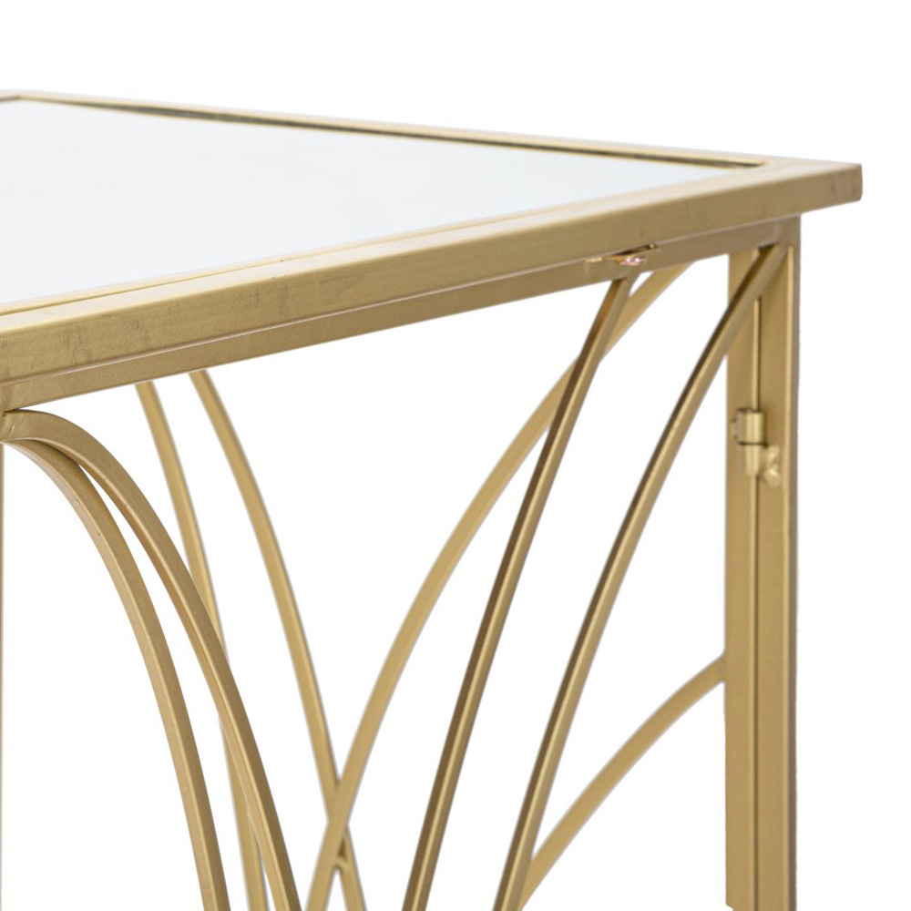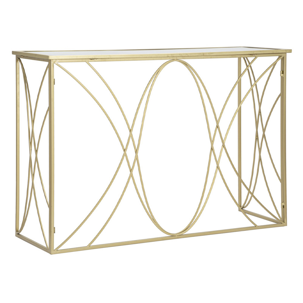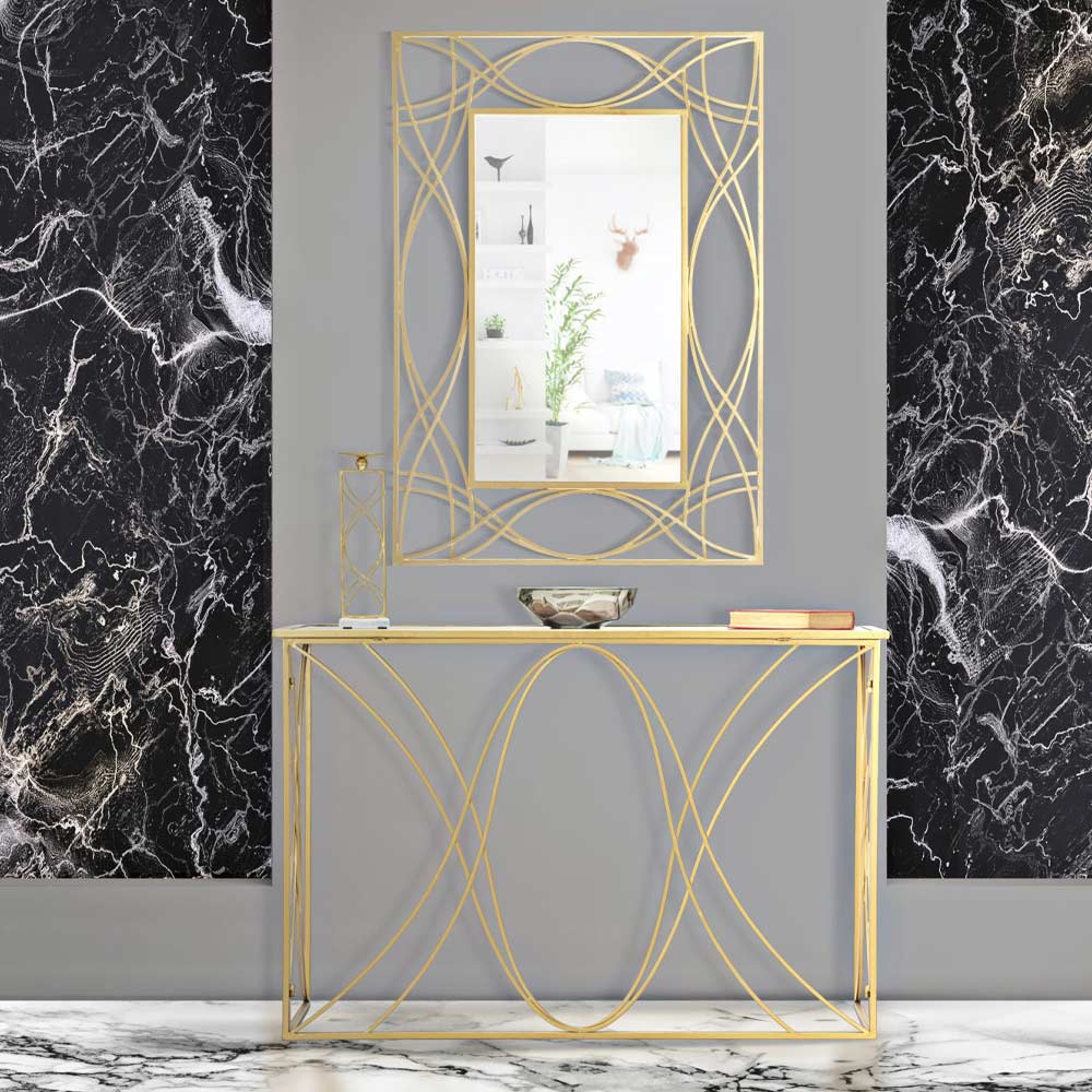 Fast indgangskonsol med struktur lavet af guldfinishjern med spejlplade . Et enkelt og fængslende design, der er unikt og eksklusivt takket være den særlige base, der bruger snedige linjer og geometriske former til at berige produktets æstetik og give et strejf af personlighed . Resultatet er en raffineret og avantgarde- konsol, der er i stand til at tilpasse sig enhver moderne stilstilstand takket være dens alsidighed og sin samtidige karakter.