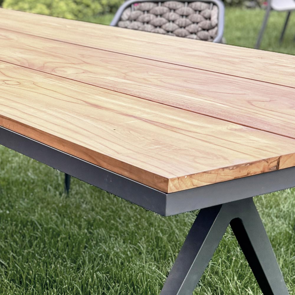 Den virkelige hovedperson er toppen i massive teaklameller , et udvalg af håndværksmæssig værdi , der giver bordet en tidløs elegance. Teaktræ, kendt for sine ekstraordinære egenskaber af modstandsdygtighed og holdbarhed , giver bordet et varmt og indbydende look, perfekt til raffinerede udendørsmiljøer.