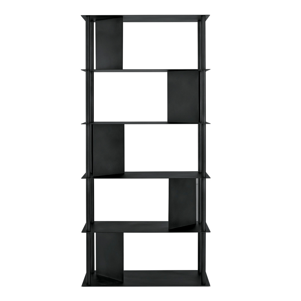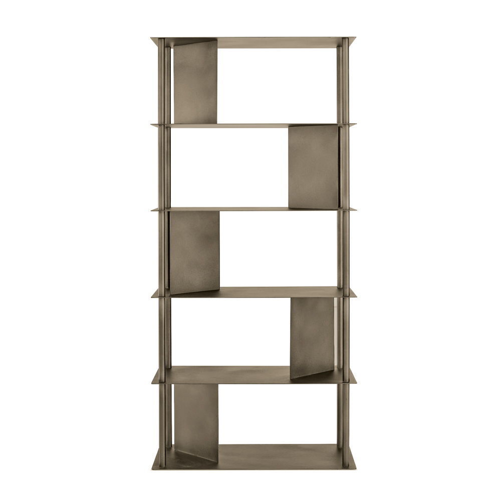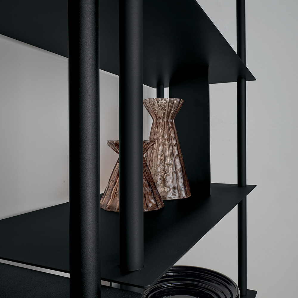 Reolen er fremstillet af malet metal og består af fire lodrette rør , der understøtter hylderne, afbrudt af skrånende plader , der definerer rummet og fungerer som understøtninger til bøger og genstande. Denne konfiguration skaber et raffineret samspil mellem faste stoffer og hulrum, hvilket giver kompositionen dynamik og dybde.