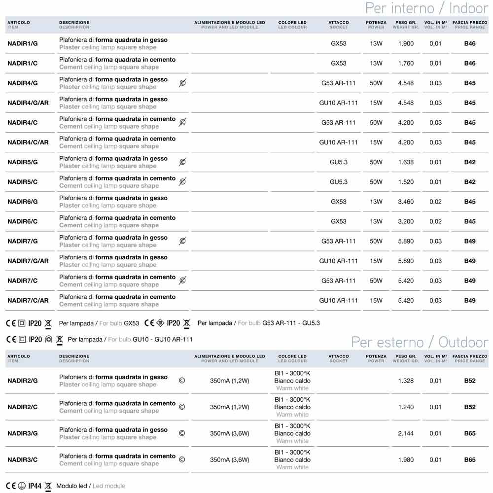 Moderne firkantet LED-loftslampe Nadir 2 fra Aldo Bernardi , fås i beton- eller gipsversion.