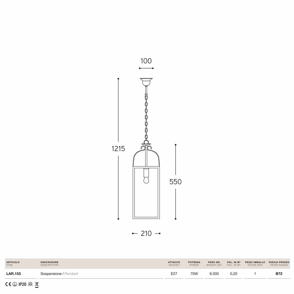 firkantet pendel i messing og glas 1 lys Aida Aldo Bernardi