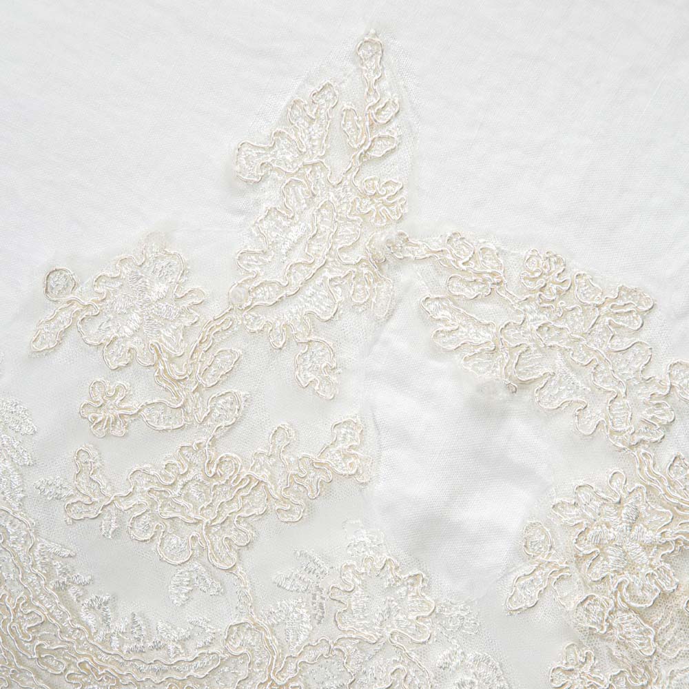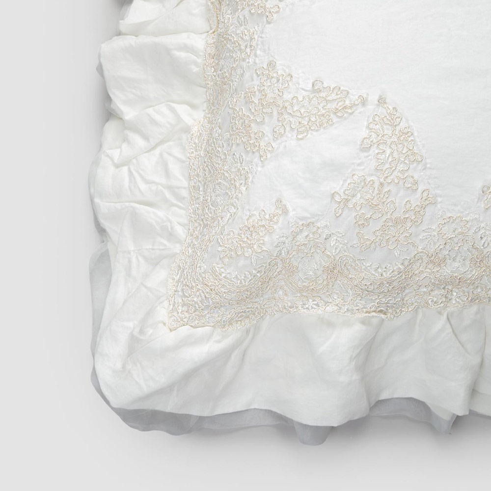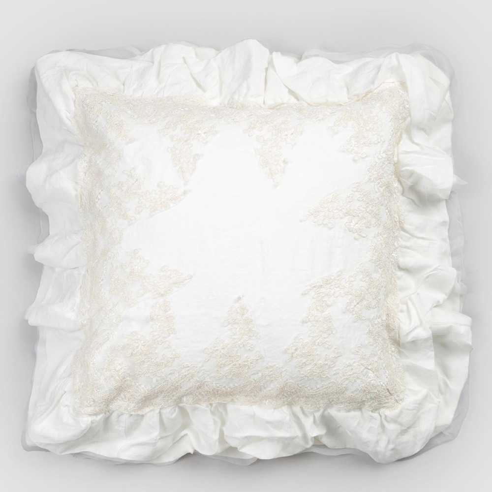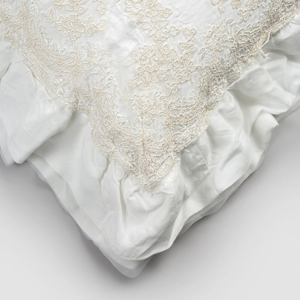 Dekorativt pudebetræk i naturhvid linned med elegant blonder og flæser, lavet i italiensk kvalitet.