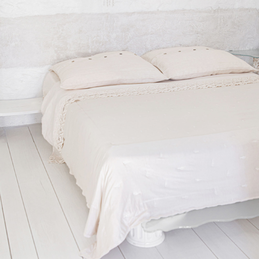 linned af høj kvalitet og er blød at røre ved takket være specielle behandlinger, der forbedrer dets naturlige udseende. Det er et ideelt stof til sengen, da det er