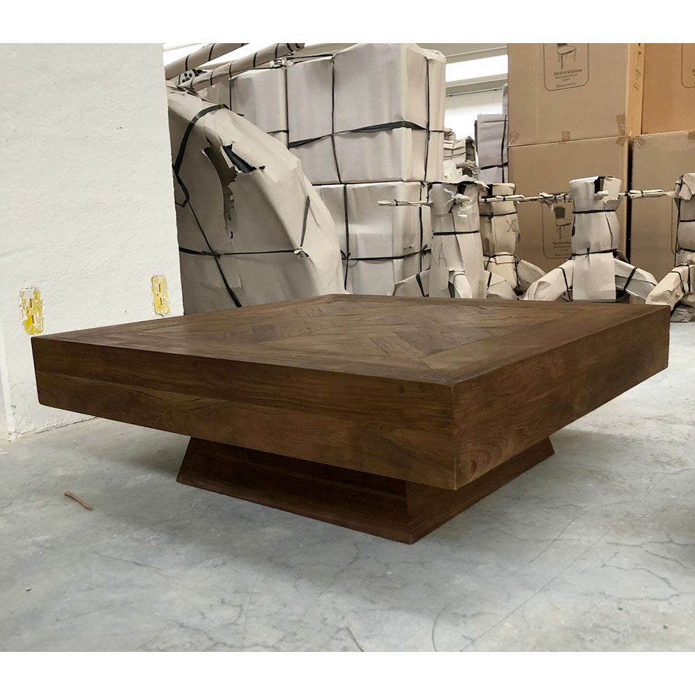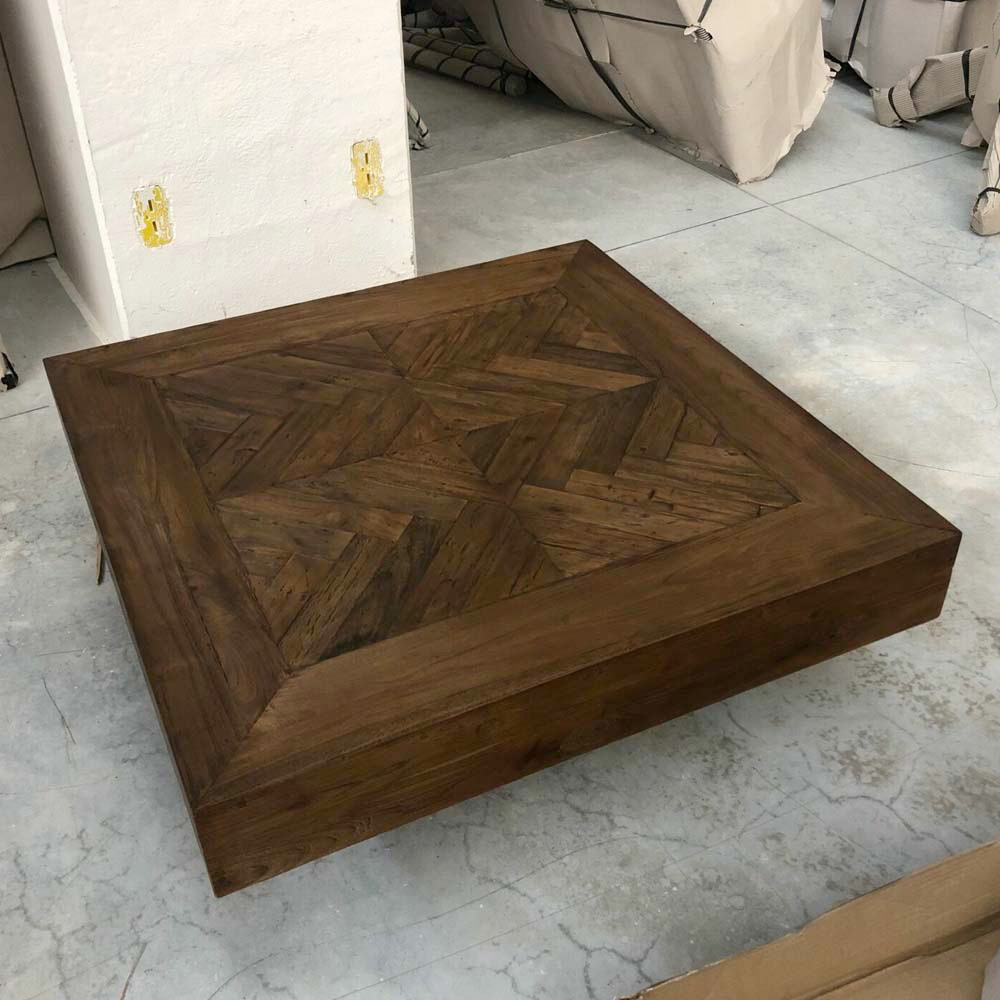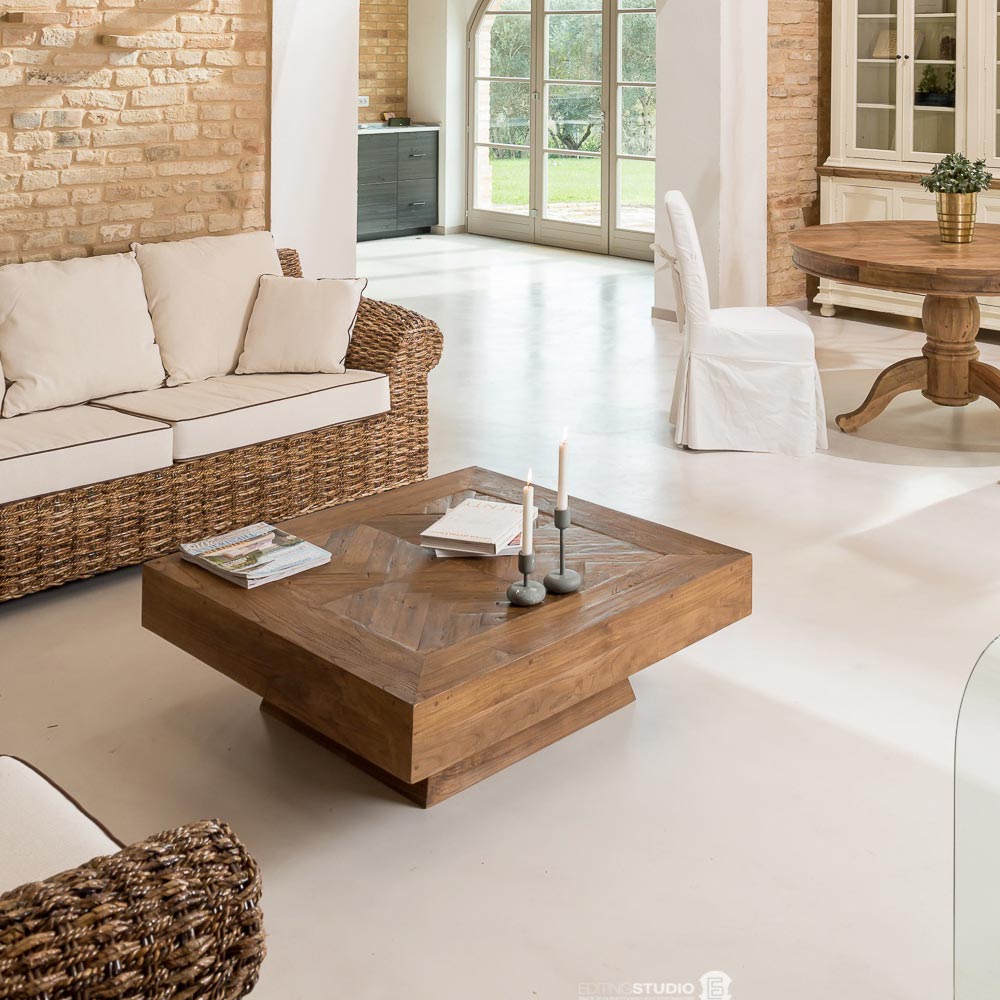 Firkantet indvendigt sofabord lavet i genbrugstræ farve kaffe naturlig .